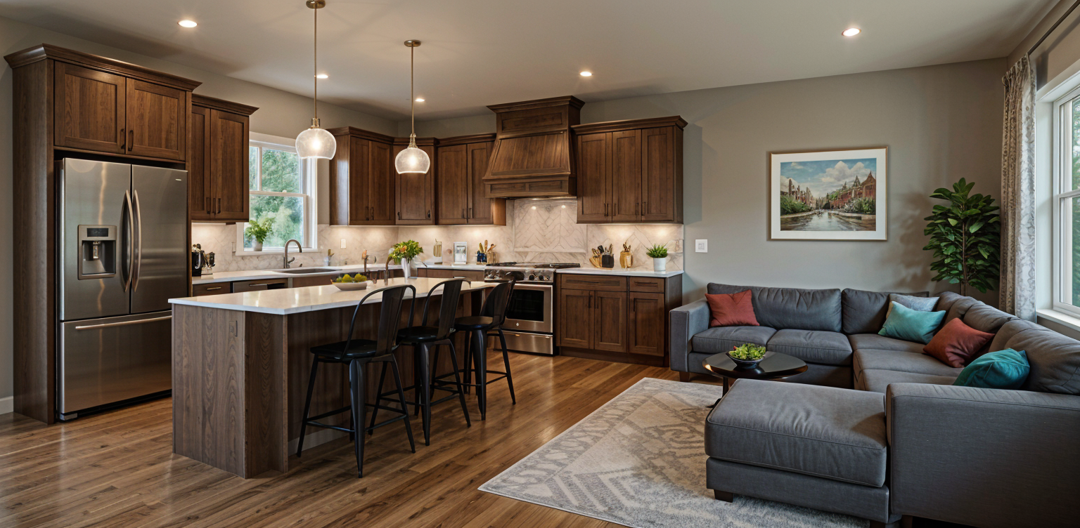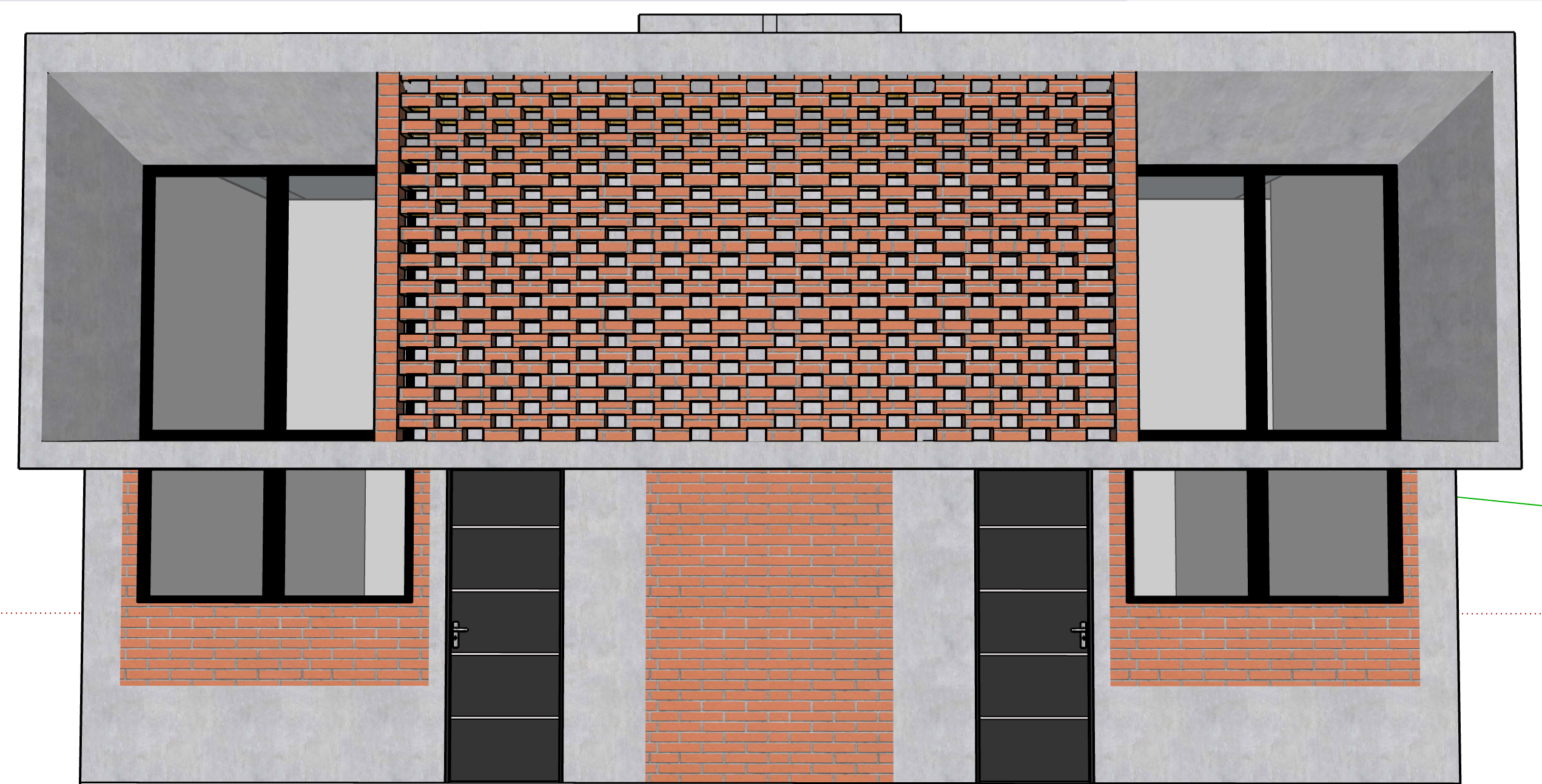 render a modern architectural facade with a harmonious blend of materials and colors the building features a pattern of classic red bricks creating a textured and visually appealing surface incorporate smooth light gray concrete for structural elements and accents providing a sleek contemporary contrast the windows are large and framed with deep black adding to the modern aesthetic the atmosphere is bright and fresh with natural light highlighting the textures and colors giving a sense of openness and modern elegance