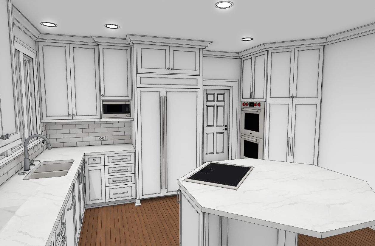 warm white kitchen with matte gold hardware medium stained hardwood flooring stools around island populate kitchen with typical cooking items and food daylight through windows and undercabinet lights turned on