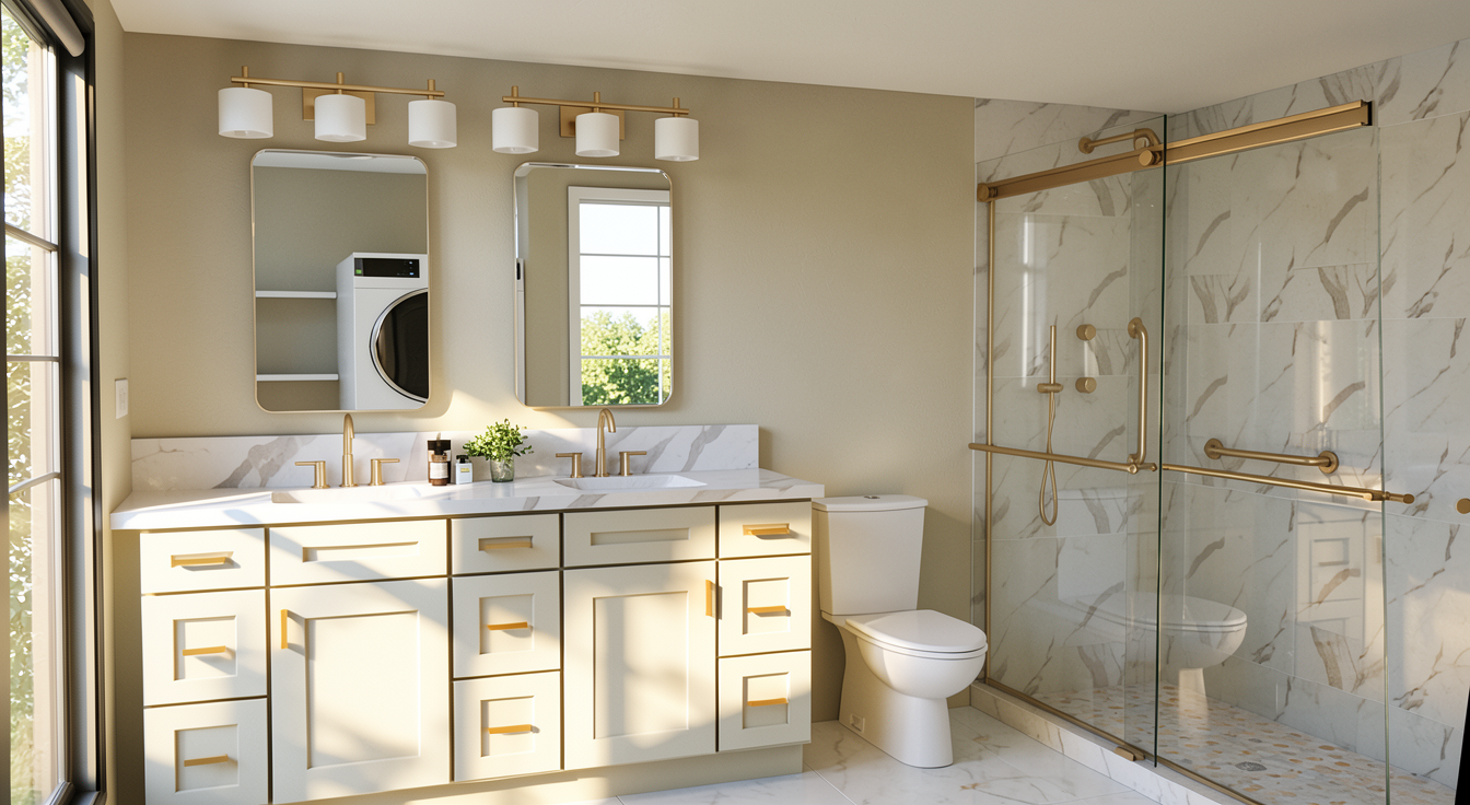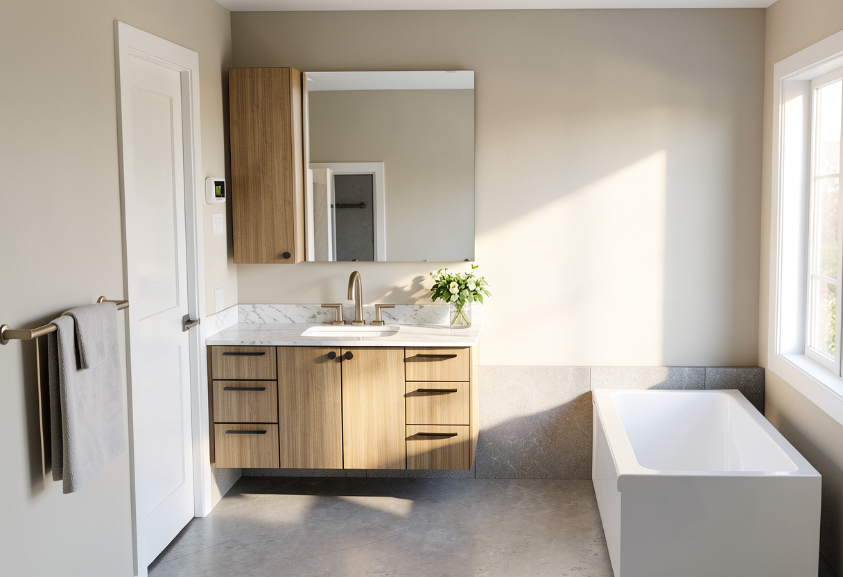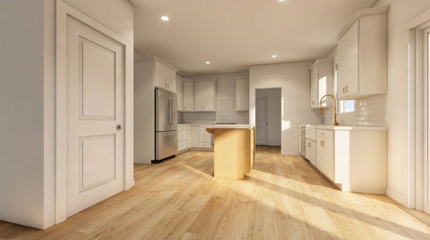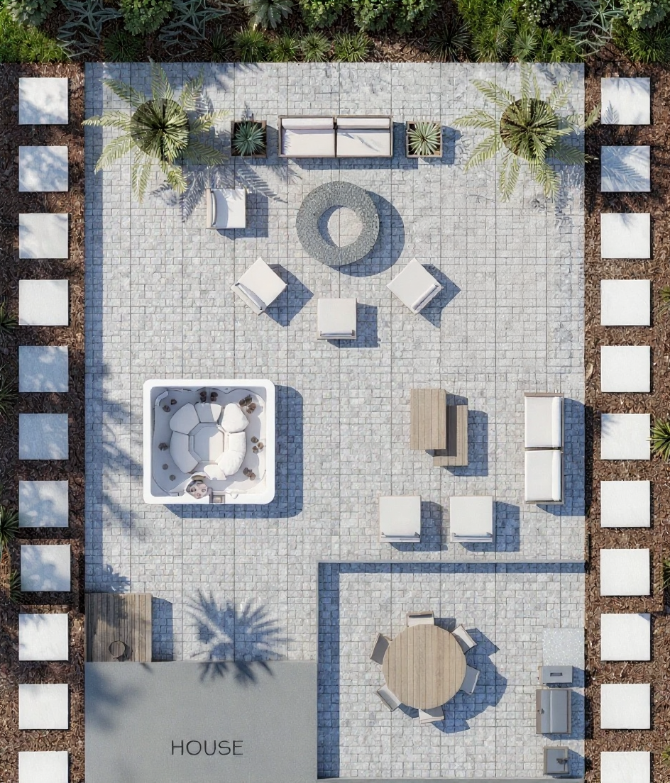 transform this floor plan into a highly realistic architectural design keep the original layout and proportions unchanged apply high quality realistic materials throughout change the flooring to light gray interlocking pavers in 24x24 dimensions enhance the hot tub to appear more realistic with water reflections and proper texture add fire in the fire pit include modern outdoor furniture with minimalist style improve textures and lighting for lifelike appearance add soft natural shadows and subtle landscaping elements like grass plants and mulch on the side areas include light colored square pavers surrounded by brown mulch maintain a clean and balanced composition top down view highly detailed professional outdoor design visualization