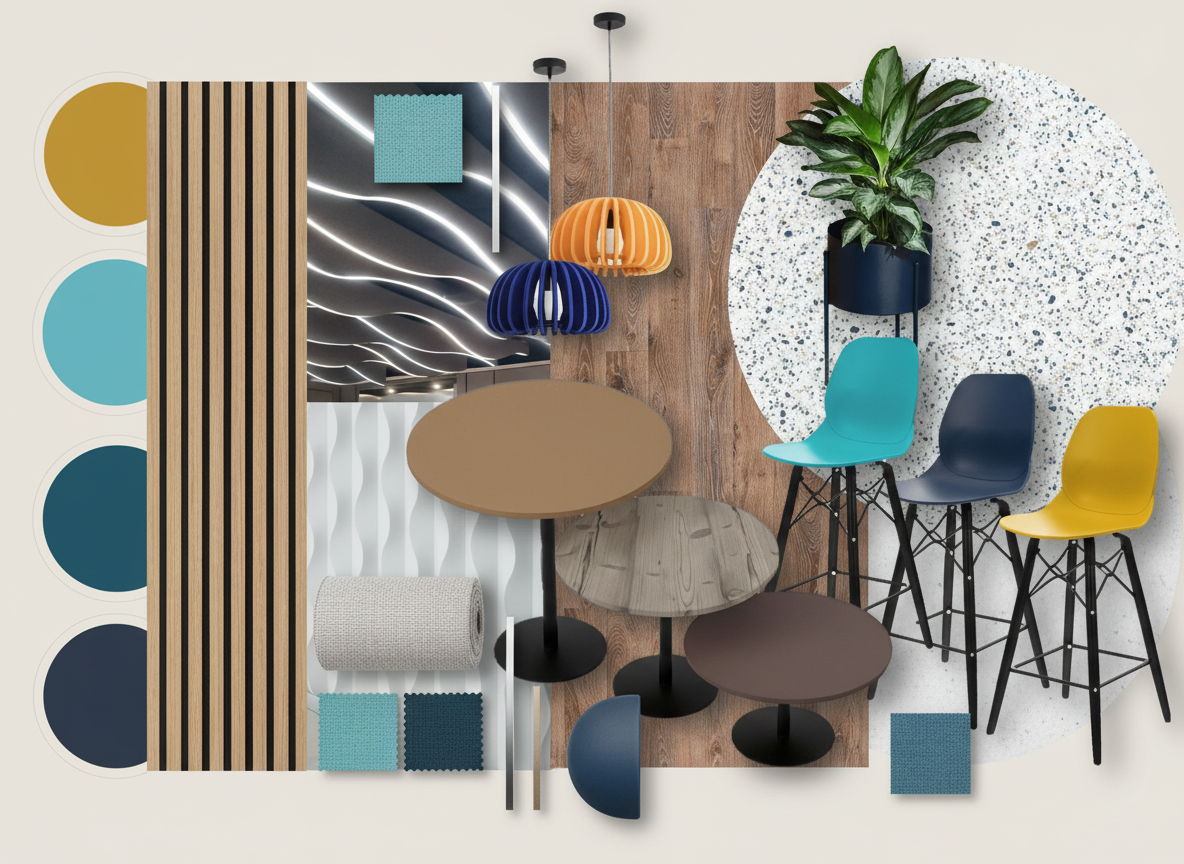 realistic terrace with natural warmer daylight pouf and pillow in brown velvet flower pots in dark grey with structure realistic background clear water bottle and glasses table lamp is slightly on lamps inside are off keep textures and proportions black floorlamps are smooth anthracite