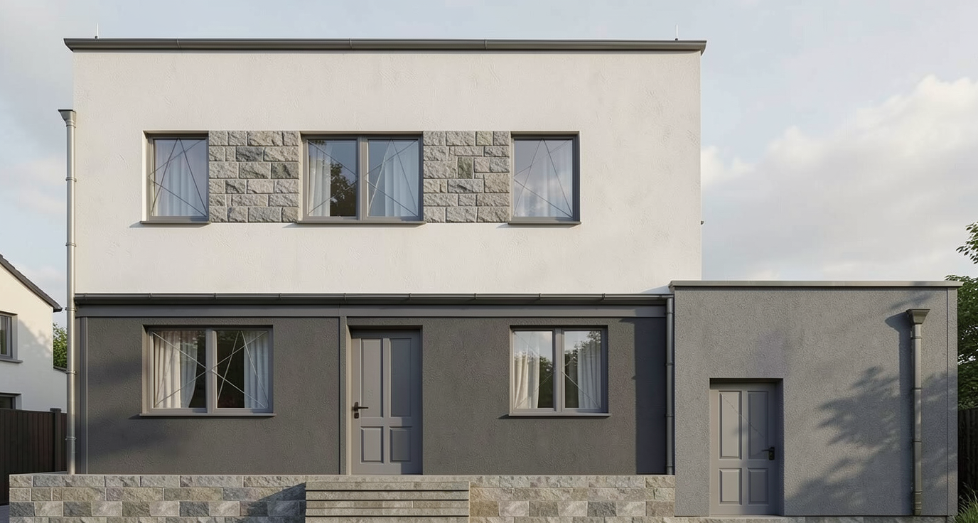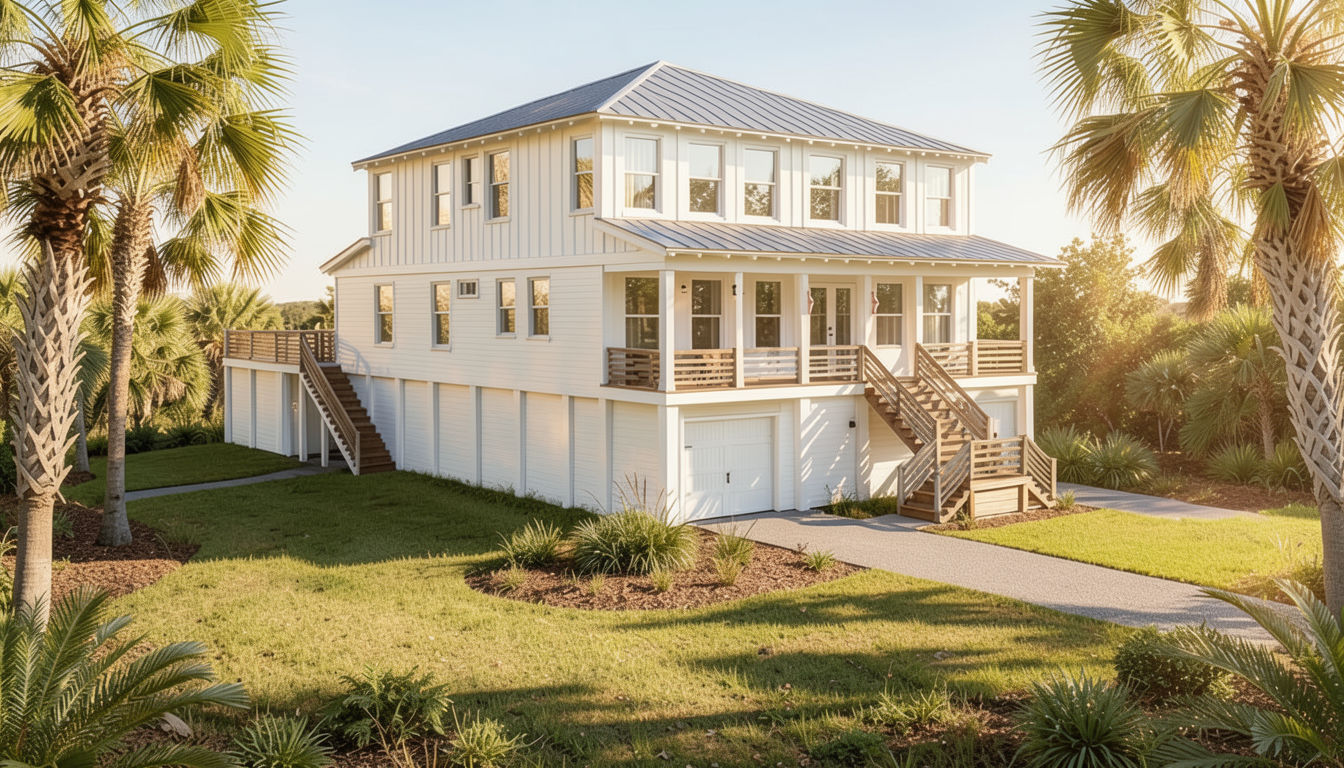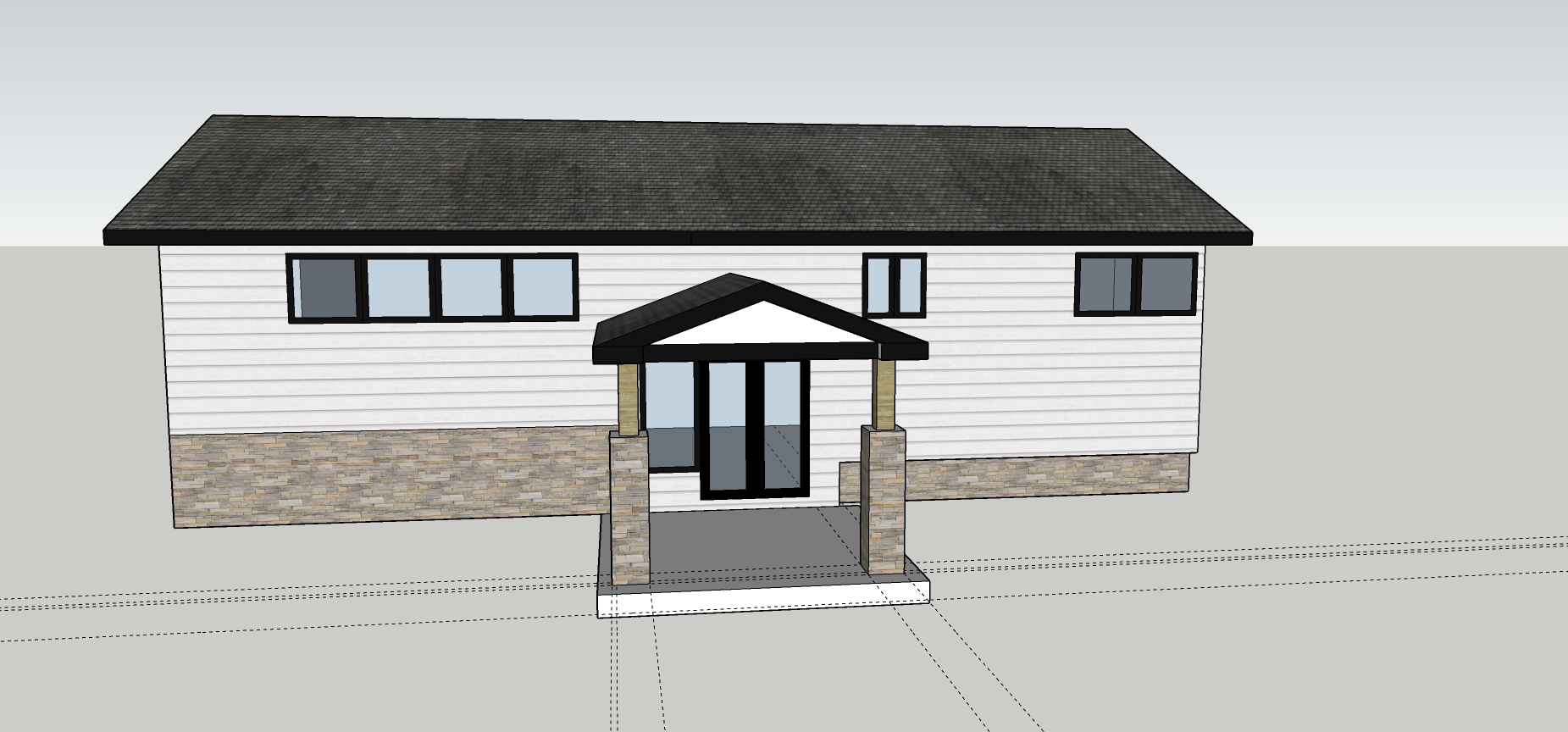 add ocean behind house and lawn in front of house with trees to sides of house make posts to entrance roof wood timbers