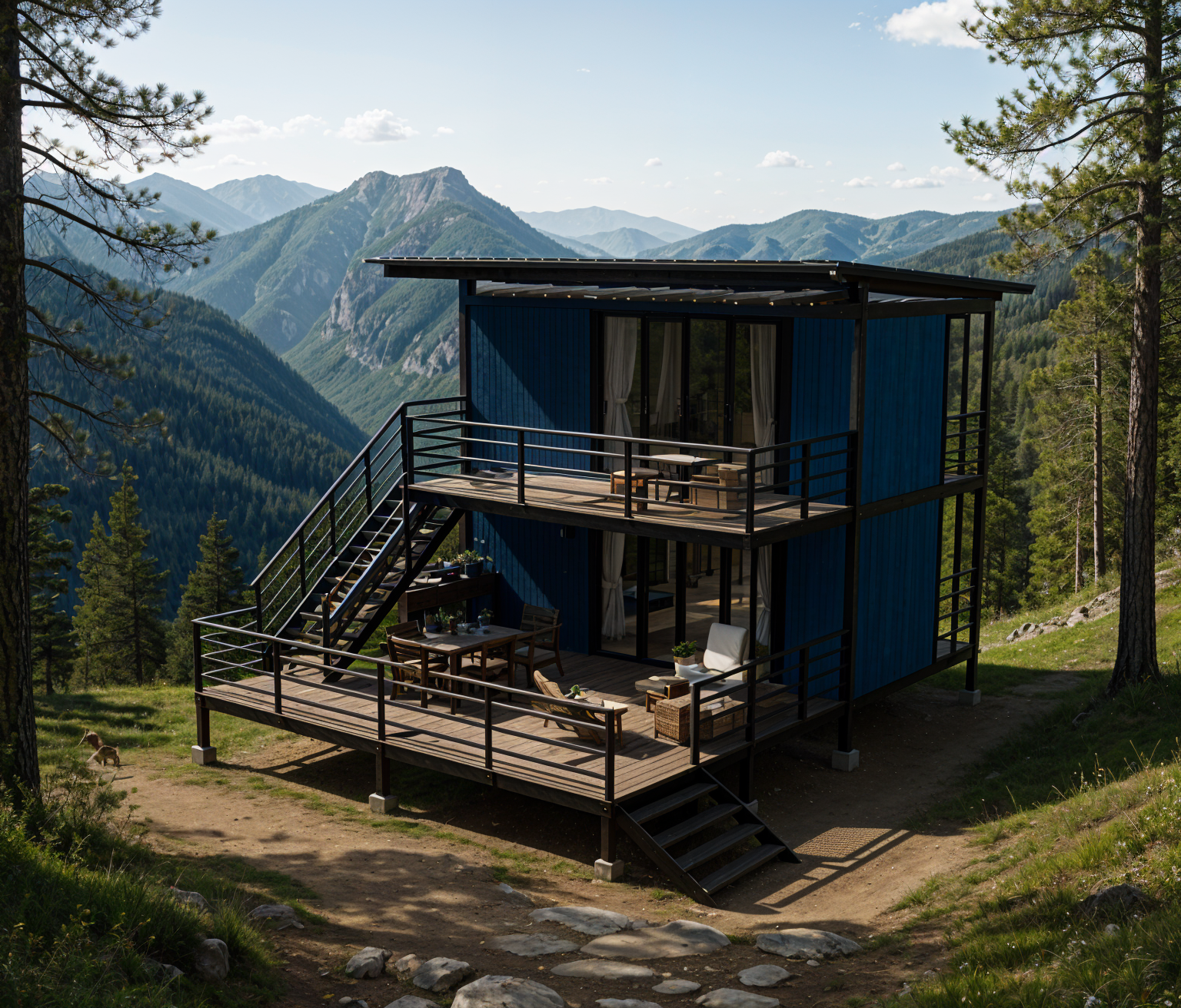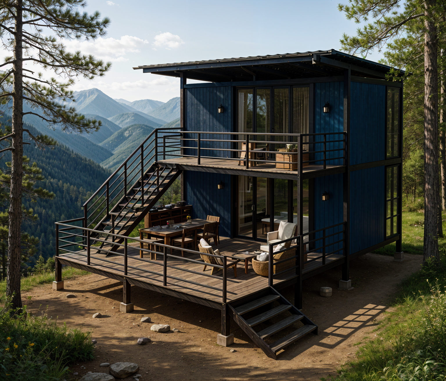 modernist exterior tall trees surrounding house shou sugi ban architecture shot on top of mountain environment bright afternoon on philippine mountains bright clear texture in photo fix railings metal frames