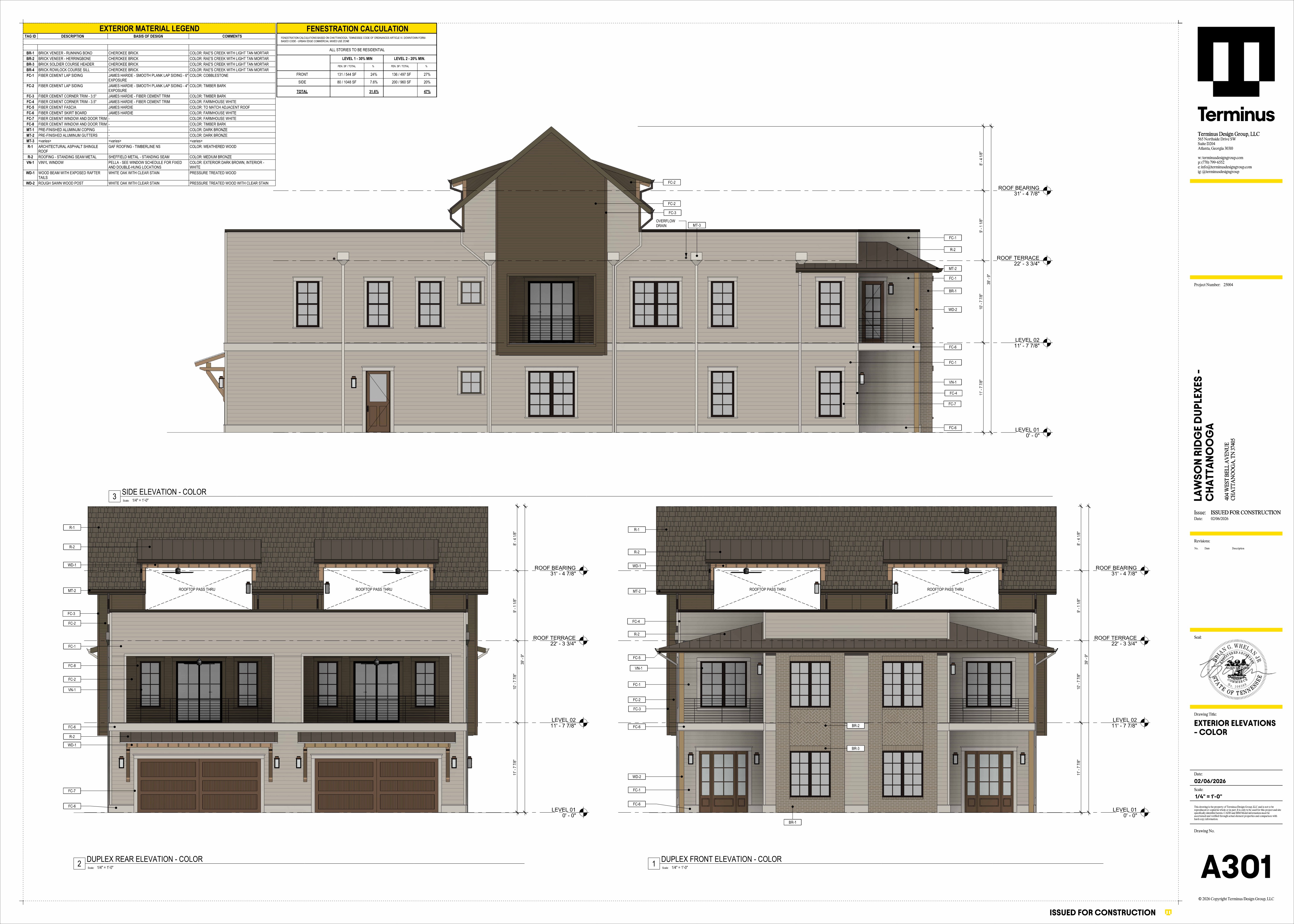 combine the duplex rear elevation duplex front elevation and the side elevation to make one building the side elevation will be the same on both the right and the left use the duplex front elevation as the front of the building and the duplex rear elevation as the back of the building