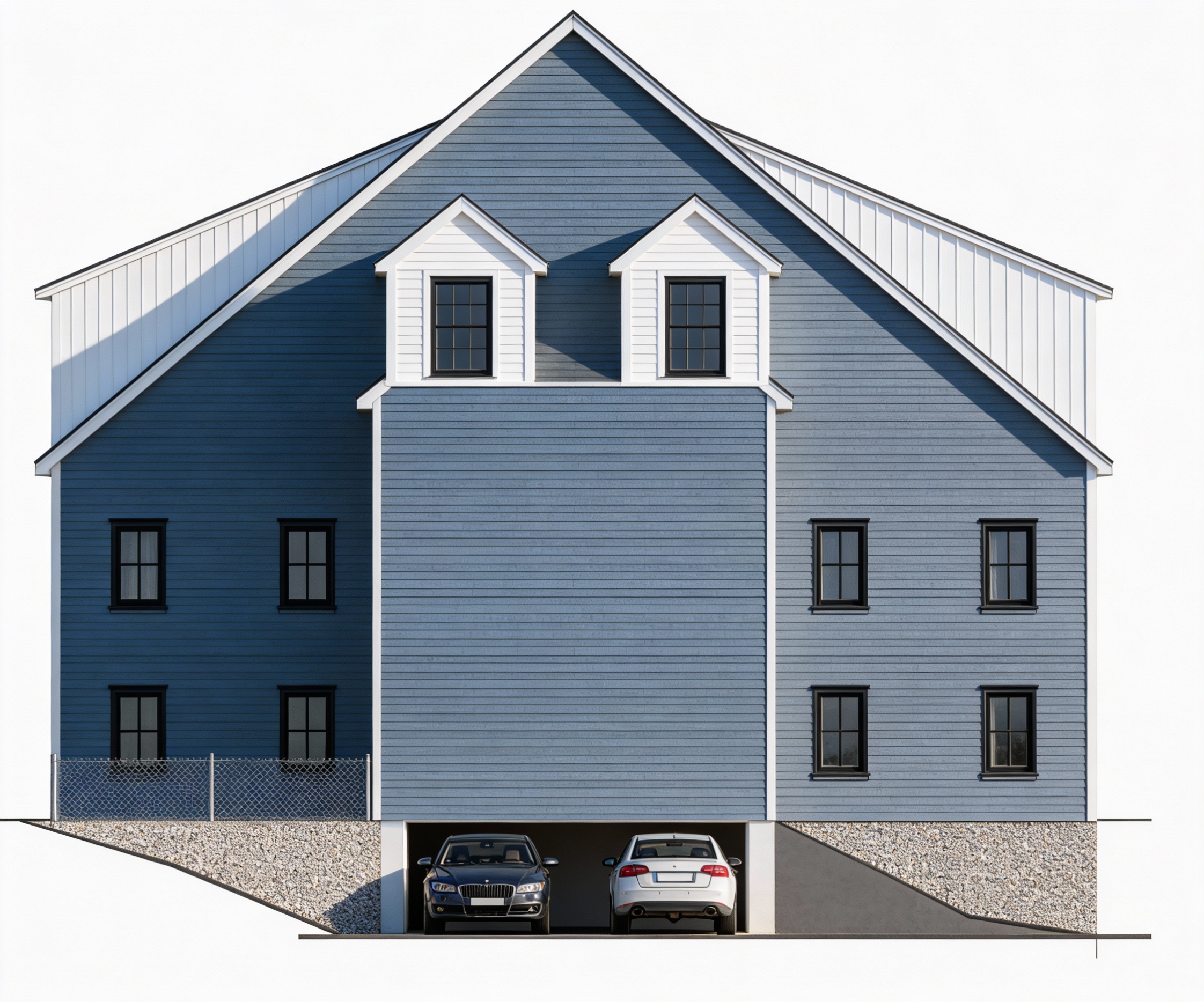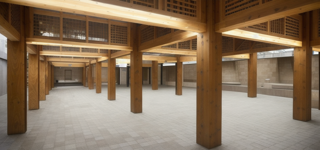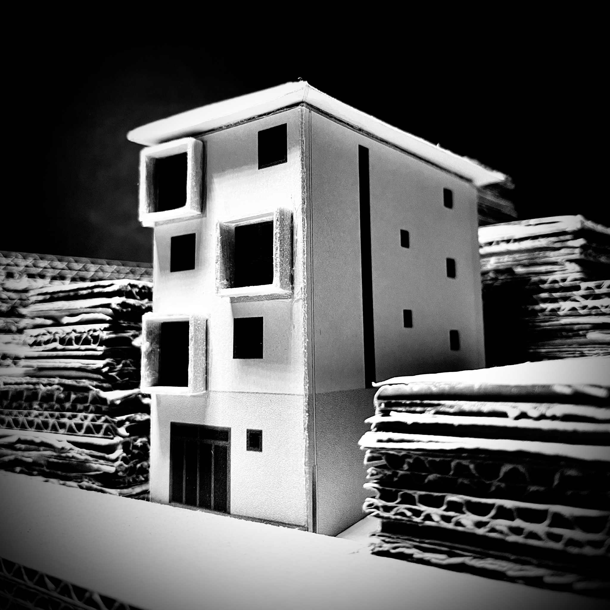 a hotel building with a ground floor caf and exterior walls clad in gray granite the three upper floors will house guest rooms with concrete cube shaped galleries and black metal window frames the eaves will be made of wood and the roof will be hipped and covered with curved ceramic tiles the time of day is midday and the sky will be light blue with white clouds the houses surrounding the hotel have white walls wooden windows and balconies and sloping red tiled roofs