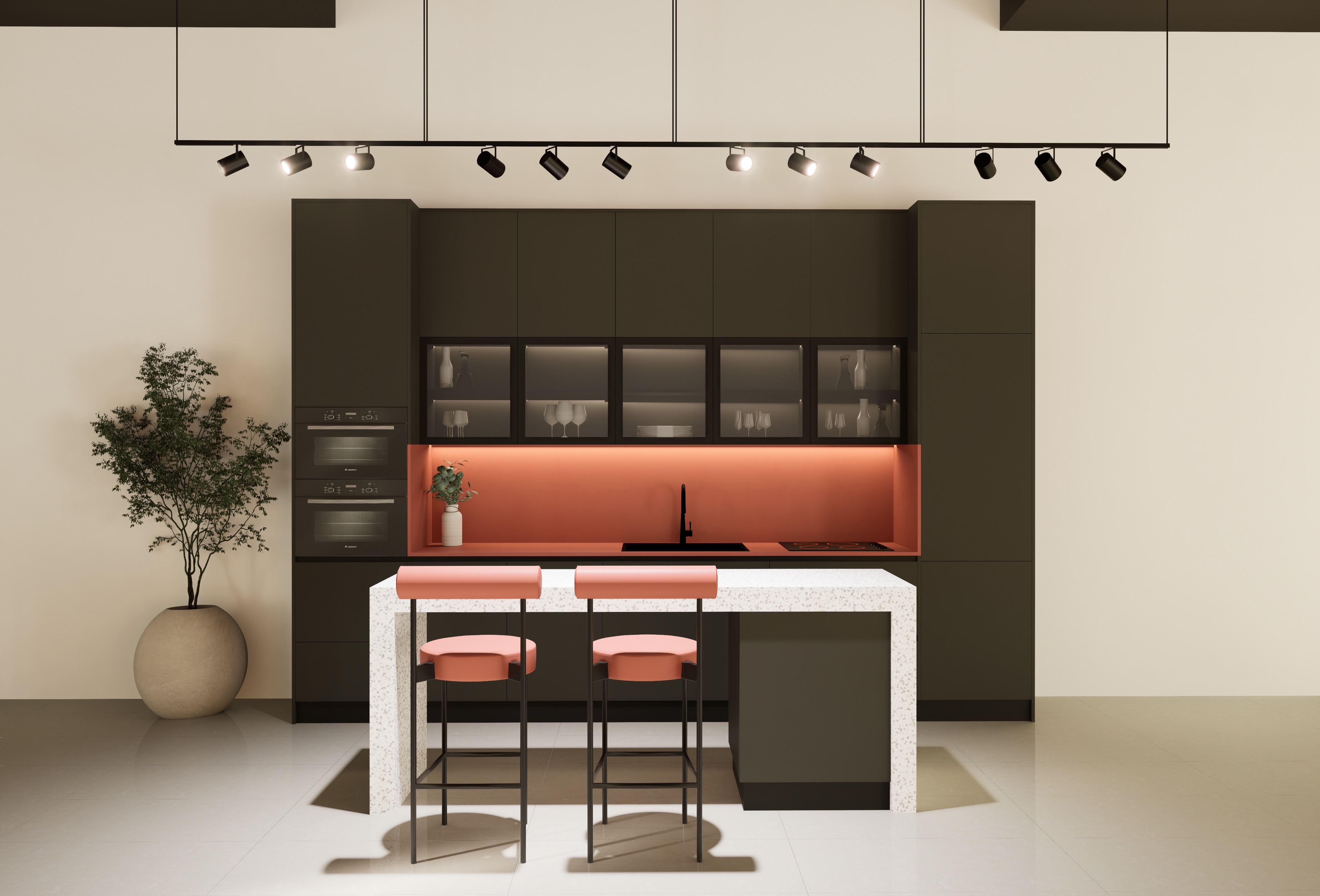 create an ultra high end photorealistic showroom kitchen render from this exact camera angle keep the exact original design layout proportions cabinetry composition island shape appliance placement upper glass cabinets backsplash niche sink position cooktop position stools plant track lighting and camera composition unchanged do not redesign anything the goal is to turn this render into a super realistic luxury showroom visualization with premium materials crisp lighting and refined styling push realism to a very high level ultra photorealistic architectural rendering real photo quality material response physically accurate global illumination realistic daylight mixed with controlled showroom lighting soft bounce light contact shadows and clean shadow gradients sharp premium detail without looking fake or overprocessed balanced editorial contrast make all materials feel truly real cabinetry deep dark matte cabinetry with soft sheen and premium lacquer finish realistic panel joints subtle reflections and elegant edge definition tall units must feel seamless and high end upper glass cabinets dark smoked glass with realistic transparency reflections and depth visible interior shelves and objects with believable lighting glass must look premium and clean not flat back wall niche warm coral terracotta backsplash niche exactly in the same tone as shown smooth matte finish with realistic material depth soft integrated under cabinet lighting glow make the niche feel rich architectural and refined island light terrazzo or stone island surface and legs with realistic grain speckling thickness and subtle polish dark island side panel must match the cabinetry material language clean edges and realistic shadowing underneath stools pink upholstered stools with realistic fabric or leather texture matte black metal frame with subtle sheen keep their design and placement exactly the same floor large light showroom floor tiles with realistic surface texture fine joints and soft reflection keep the finish elegant and premium not glossy mirror like lighting track lights above must look realistic with accurate metal finish and believable spotlight glow improve overall showroom atmosphere with clean professional light balance realistic highlights on cabinetry stone and glass add modern premium showroom accessories without changing the design keep accessories minimal and elegant add a few curated high end objects such as a sculptural tray premium kitchen decor design books elegant glassware or refined countertop styling place accessories naturally on the countertop inside the glass cabinets and subtly in the backsplash niche styling must feel modern architectural expensive and showroom ready do not overcrowd the scene improve the plant realism on the left make the plant look natural and premium give the pot a realistic stone or plaster texture keep it elegant and minimal overall mood modern luxury showroom refined editorial architectural ultra realistic premium clean sophisticated negative instructions do not change the design do not move the island do not change cabinet layout do not alter the coral backsplash color do not redesign stools do not change the lighting layout do not add extra furniture do not change the camera angle only enhance realism and add tasteful modern showroom accessories add this final line too keep the exact original composition and design untouched only improve realism material depth showroom atmosphere and add minimal modern premium accessories