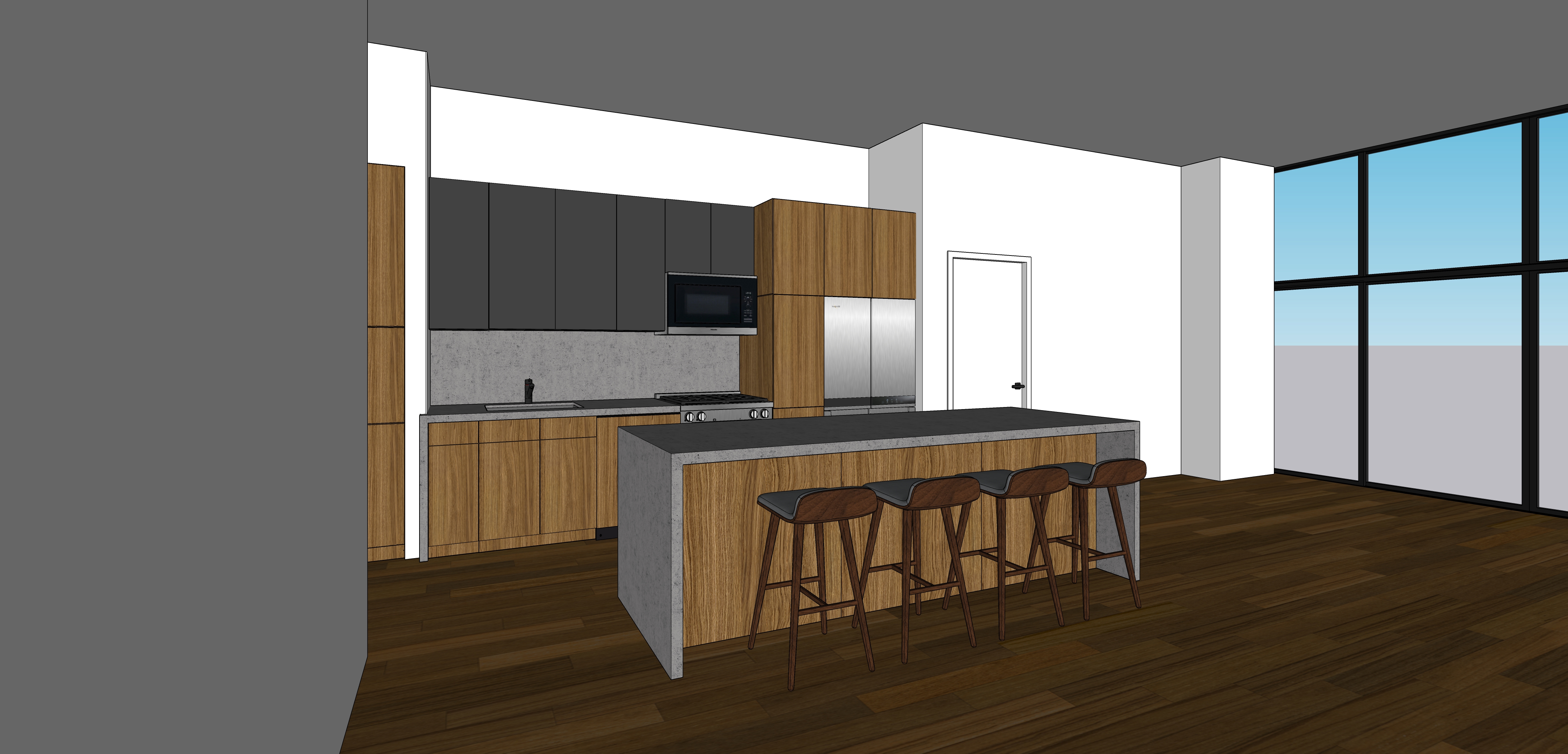 render this view exactly how it saved from sketchup and shown the city of chicago skyline in the windows