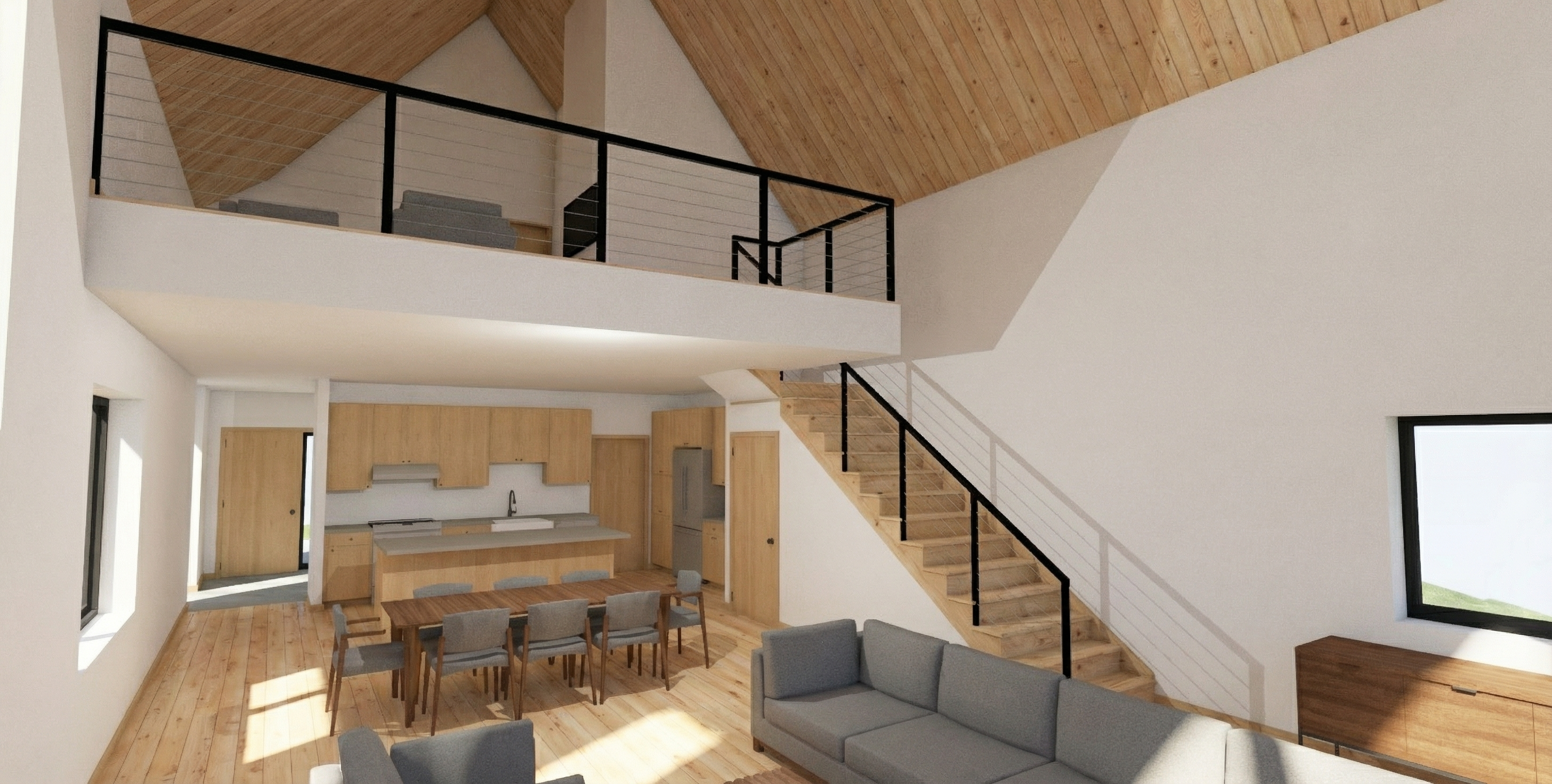 great room with grey staggered tile floor picture over grey bufffet table modern cubist shelves made of natural wood kitchen cabinets grey