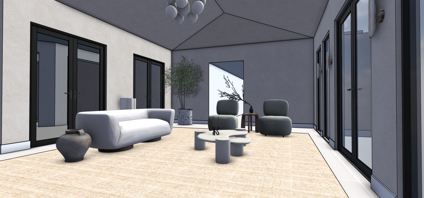 create a modern living room with a minimalist design featuring light gray walls and a darker gray ceiling for a contemporary feel include a white curved sofa and a set of three round coffee tables in a mix of light wood and charcoal tones position two deep green armchairs opposite the sofa add an elegant spherical chandelier with soft white lighting overhead place a tall potted plant with lush green leaves in the corner incorporate sleek black framed floor to ceiling windows along one wall allowing natural light to fill the space enhance the serene atmosphere with a subtle warm glow coming from modern wall sconces ensure the flooring is a smooth white tile adding to the clean and uncluttered ambiance keep everything as it is