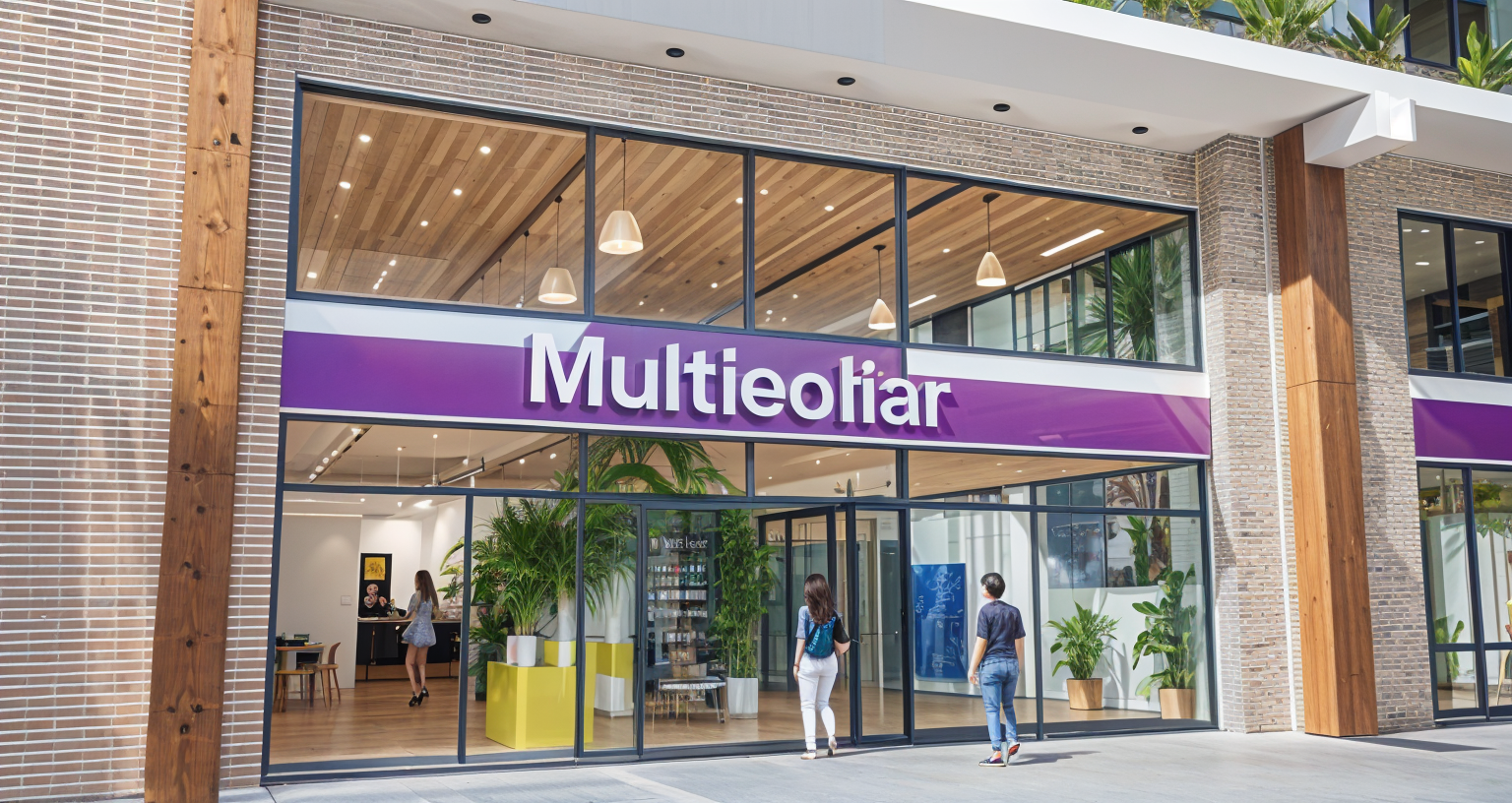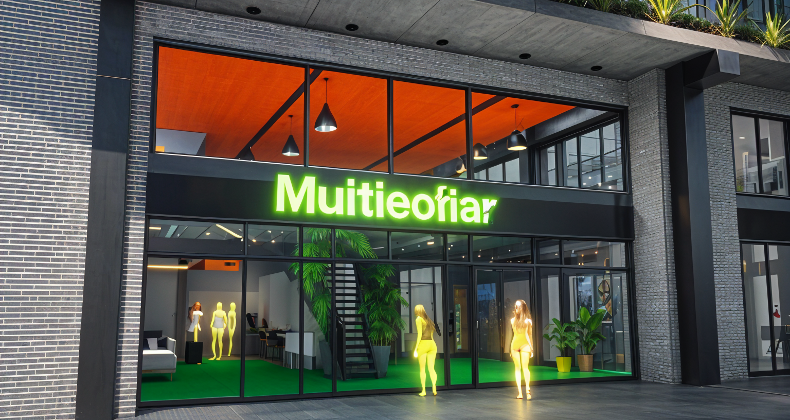 international style exterior shot render a modern industrial workspace with a sleek and minimalist design the flooring is charcoal grey providing an elegant foundation walls are clad in smooth concrete while large floor to ceiling glass panels reveal lush green plants outside the overall atmosphere is futuristic and open with soft ambient lighting creating a warm and inviting environment in the foreground display white robotic arms with black accents hinting at advanced technology on the right there are high stools with light wooden legs and white seats paired with a matte black counter behind an orange industrial robot stands out surrounded by light wooden tables include touches of greenery inside with potted plants featuring vibrant green leaves adding a refreshing contrast ensure all elements are bathed in soft natural light streaming through the windows enhancing the colors and textures of the materials used architecture