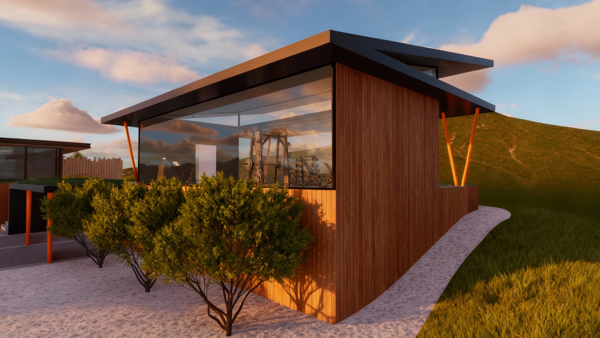 this is the right side elevation of the house i need this to look realistic with horizontal dark grey siding black trim and black shingled roof on a grassy lot with trees in the background