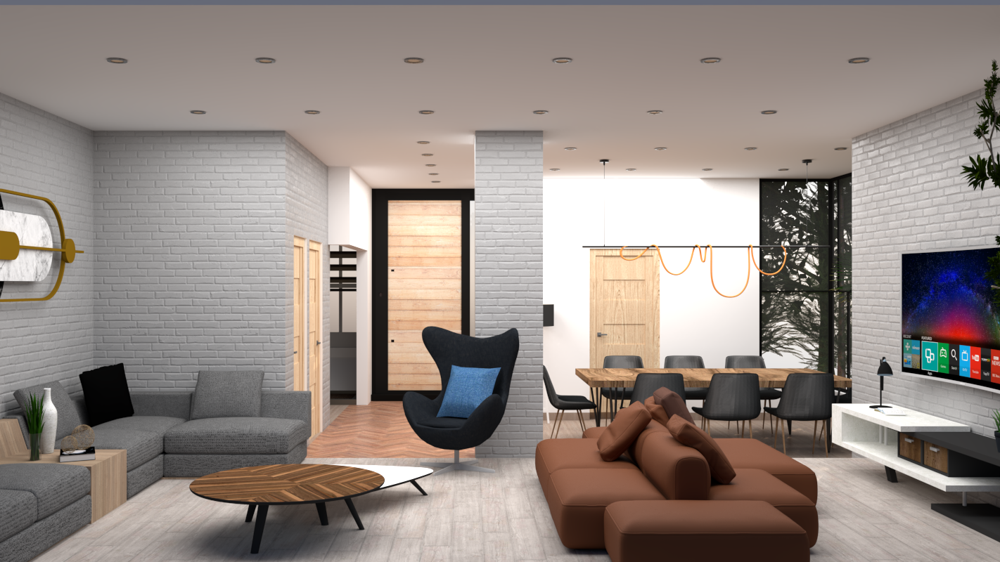 make this render look like an actual real life photo keep the wood front door and add a little garden outside the window