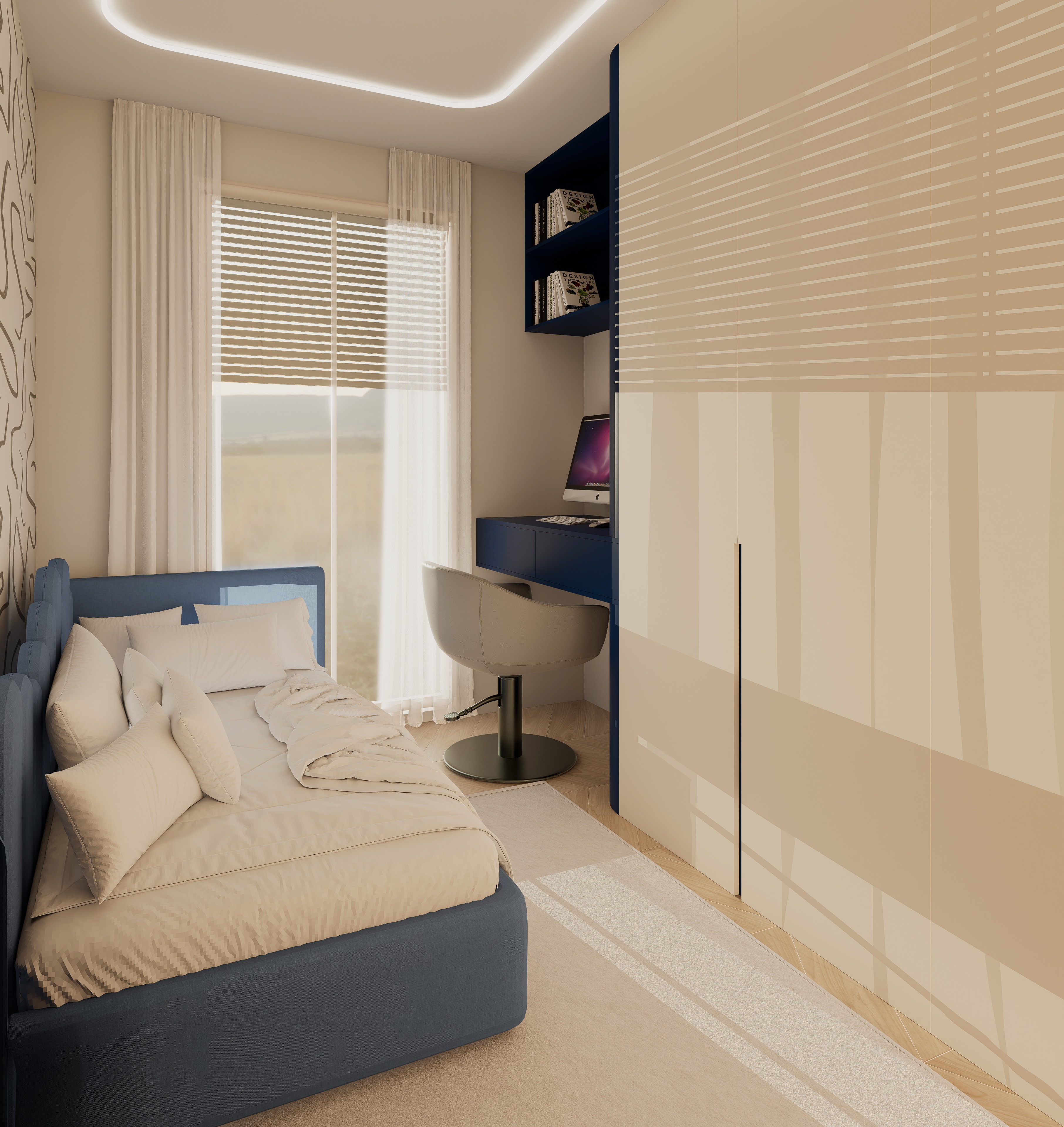 ultra realistic interior render of a modern minimalist bedroom with blue accent elements do not change the design layout proportions materials or camera angle do not add any accessories decor objects or styling elements enhance realism with physically accurate lighting and materials only bed upholstered in deep muted blue fabric soft texture matte finish bedding neutral white cream tones natural wrinkles and folds realistic fabric cotton linen feel no decorative pillows beyond essential sleeping setup wardrobe full height panels in glossy beige cream finish very subtle reflections clean flat surface handles minimal vertical black profiles desk area desk shelving deep muted blue matte finish smooth surfaces chair neutral upholstered seat with soft texture matte black base curtains sheer white fabric soft folds translucent roller blinds warm beige tone filtering daylight flooring light oak wood in herringbone pattern matte finish rug neutral light tone soft texture no decorative elements lighting ceiling indirect led strip 3000k warm white smooth continuous glow natural daylight entering from window center left diffused through curtains soft directional shadows on floor and wardrobe realism details slight reflections on glossy wardrobe controlled not mirror like micro imperfections on painted and wood surfaces subtle fabric creases on bedding ambient occlusion under bed desk and along edges natural light falloff for depth important remove or avoid screens content realism focus monitor should be minimal or neutral not a focal point overall clean minimal architectural visualization no accessories no staging balanced contrast between blue accent and neutral palette high end realistic output not overprocessed