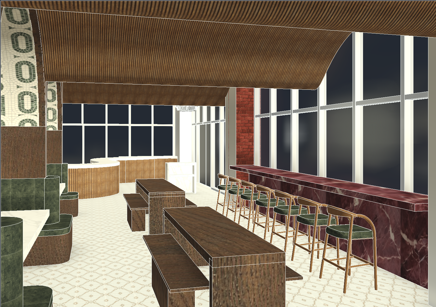 dont change or move anything only add evening light from wondows and led light from slats in ceiling add city street outside