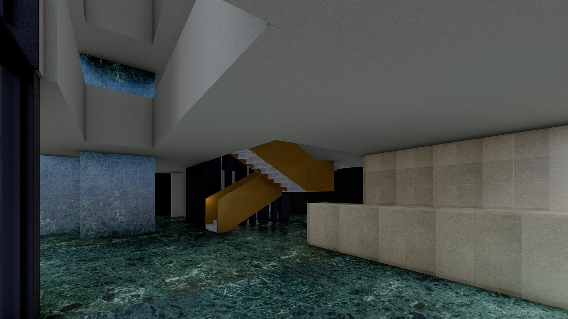 this is an image of a reception the yellow stone is a reception counter and a stone clad wall behind it