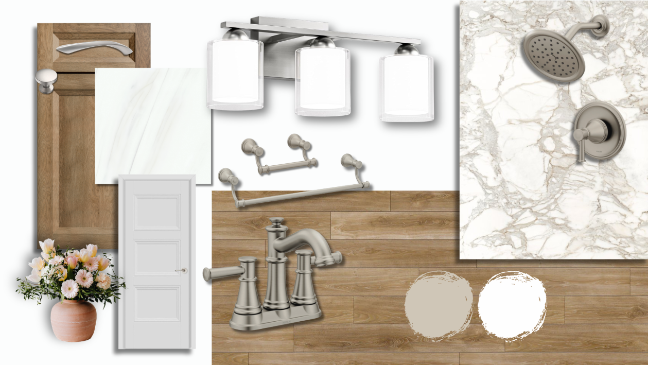 render a beautiful interior design mood board featuring a wooden cabinet door in rich oak tones complemented by a sleek silver handle include a modern white door with three panels alongside a metal kitchen faucet in brushed stainless steel highlight an elegant chandelier with frosted glass shades in soft cream matched with two pendant lights in similar tones set against a subtle cream and beige marble background incorporate a light wood floor texture add a warm terracotta vase filled with lush white and soft pink flowers for a touch of freshness the overall atmosphere is serene and inviting with neutral colors like beige and crisp white creating a harmonious and sophisticated balance
