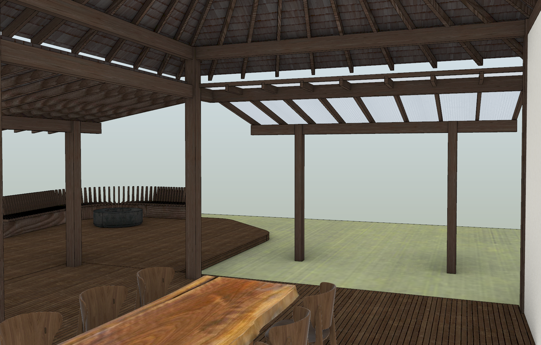 lush planting in the middle ground by the wooden columns that recess into the ground with small organic stone boulder footings surrounded by wildly planted lush ferns and shrubs taking over the middle ground the access path below the glass pergola has receding grass planting as an access path into the building the background has a lush tropical forest planting the pergola infront has a clear glass panel above covered with creepers and climbers all materials maintained as original image don t remove the wooden deck flooring inside or outside hd photograph in broad daylight