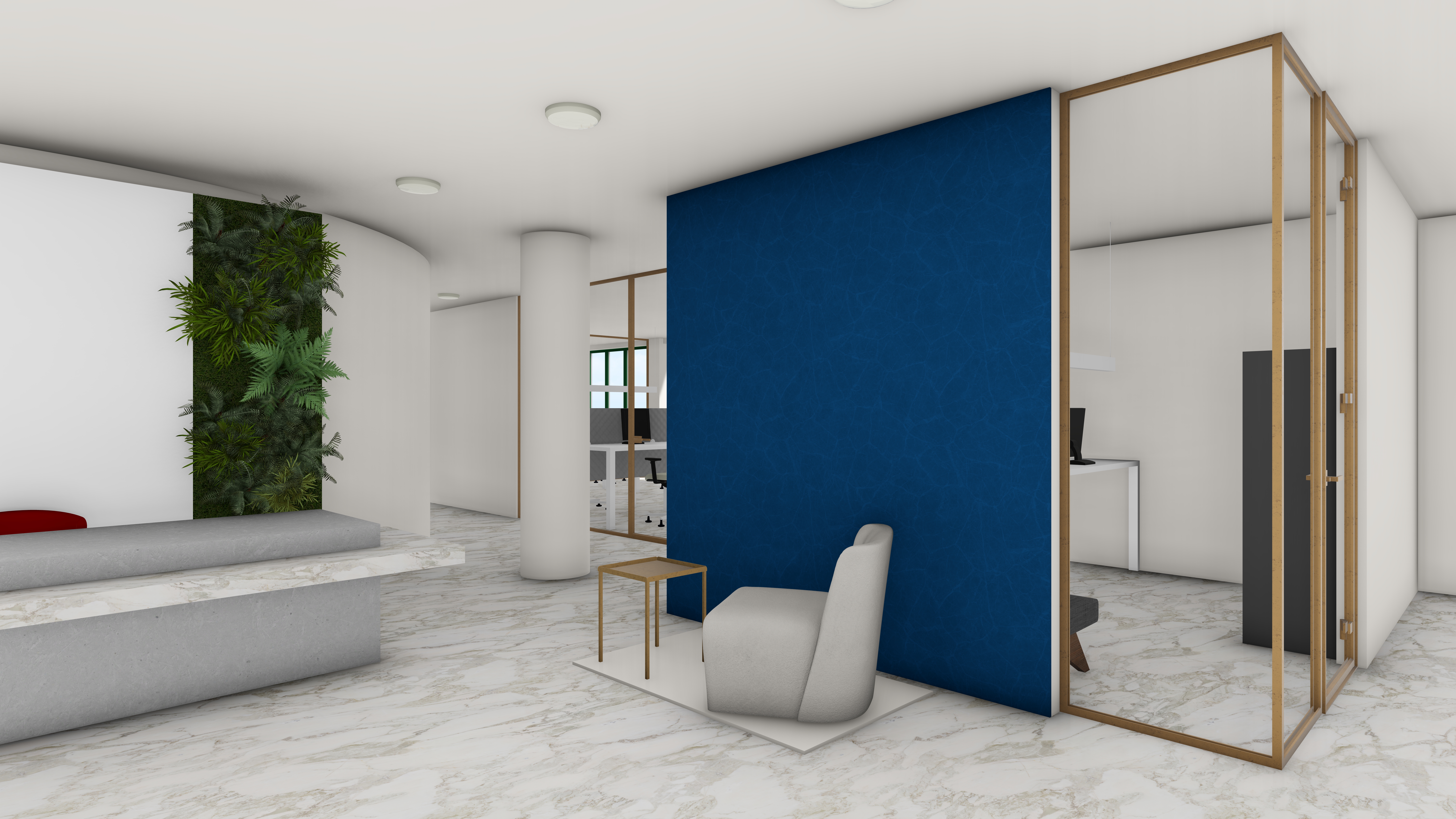 interior shot the focal point is a vibrant deep blue accent wall enriched with textures adjacent is a lush vertical garden with various shades of green adding a touch of nature the flooring is a polished marble with white and beige veining