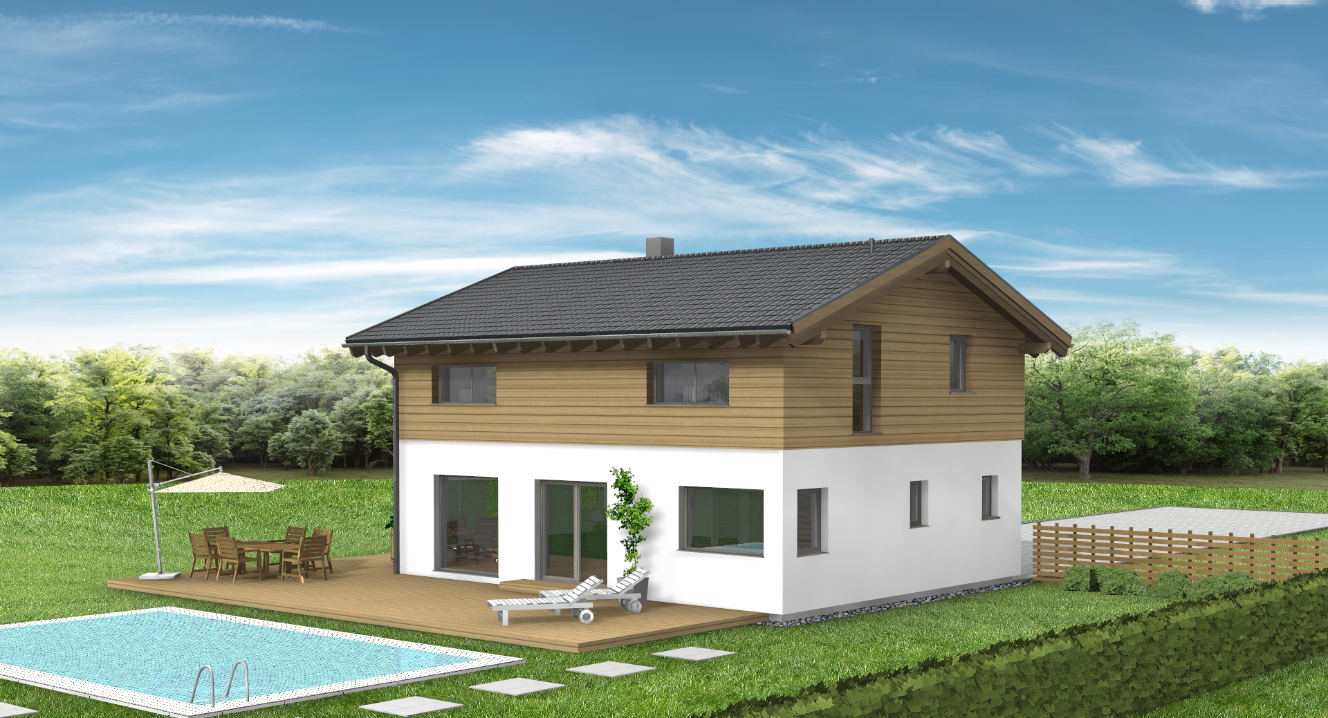 visualisiere mir das haus fotorealistisch bei sonnenuntergang