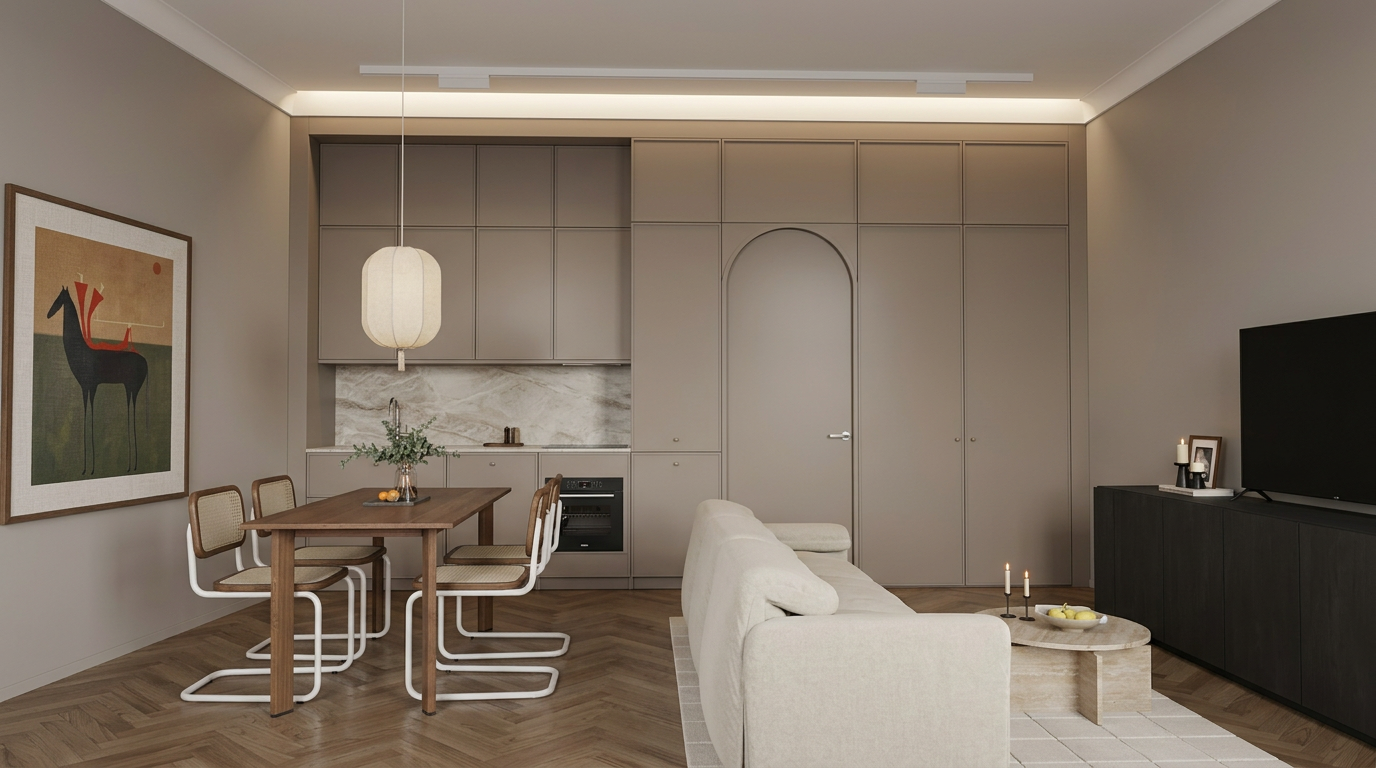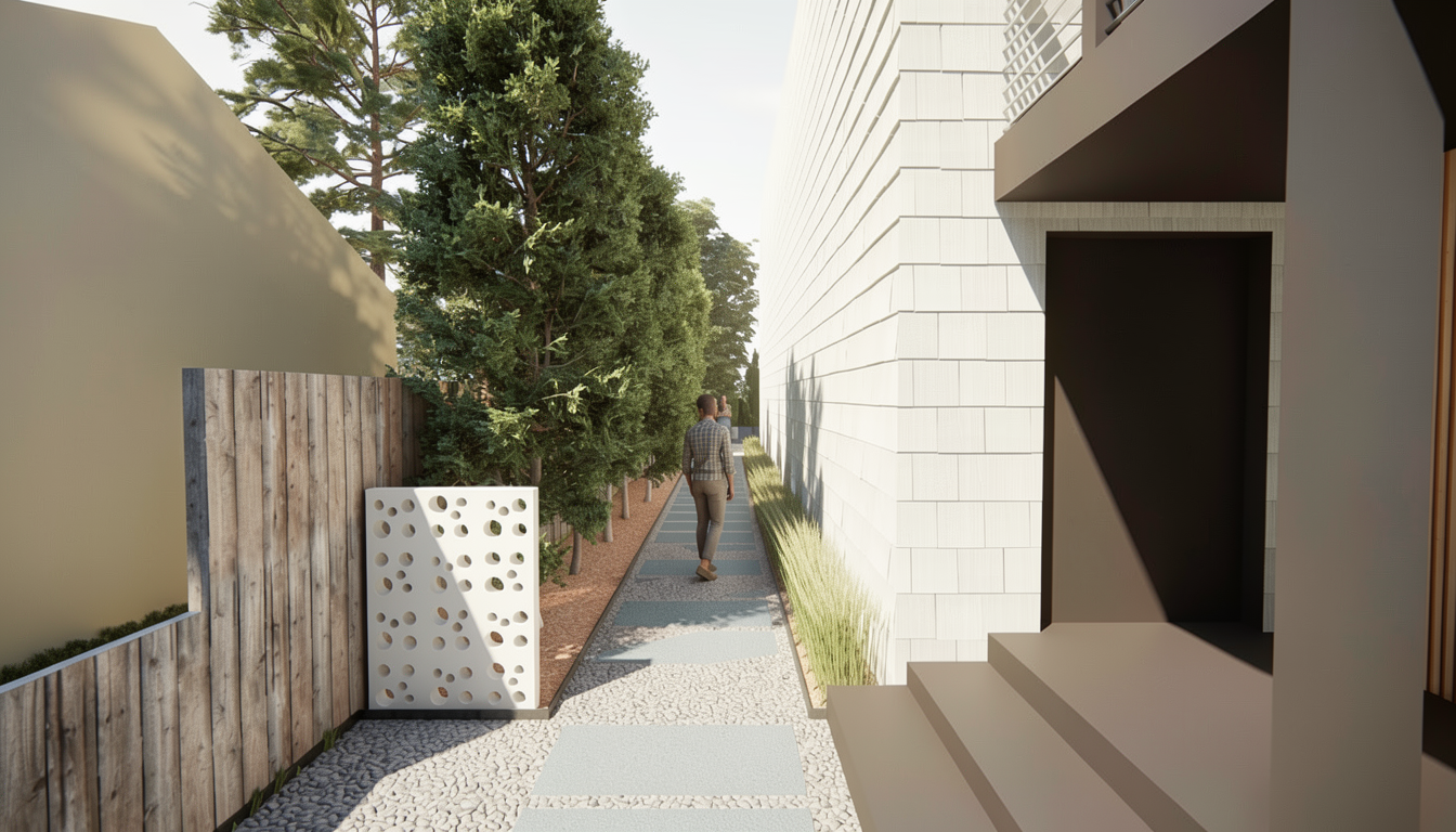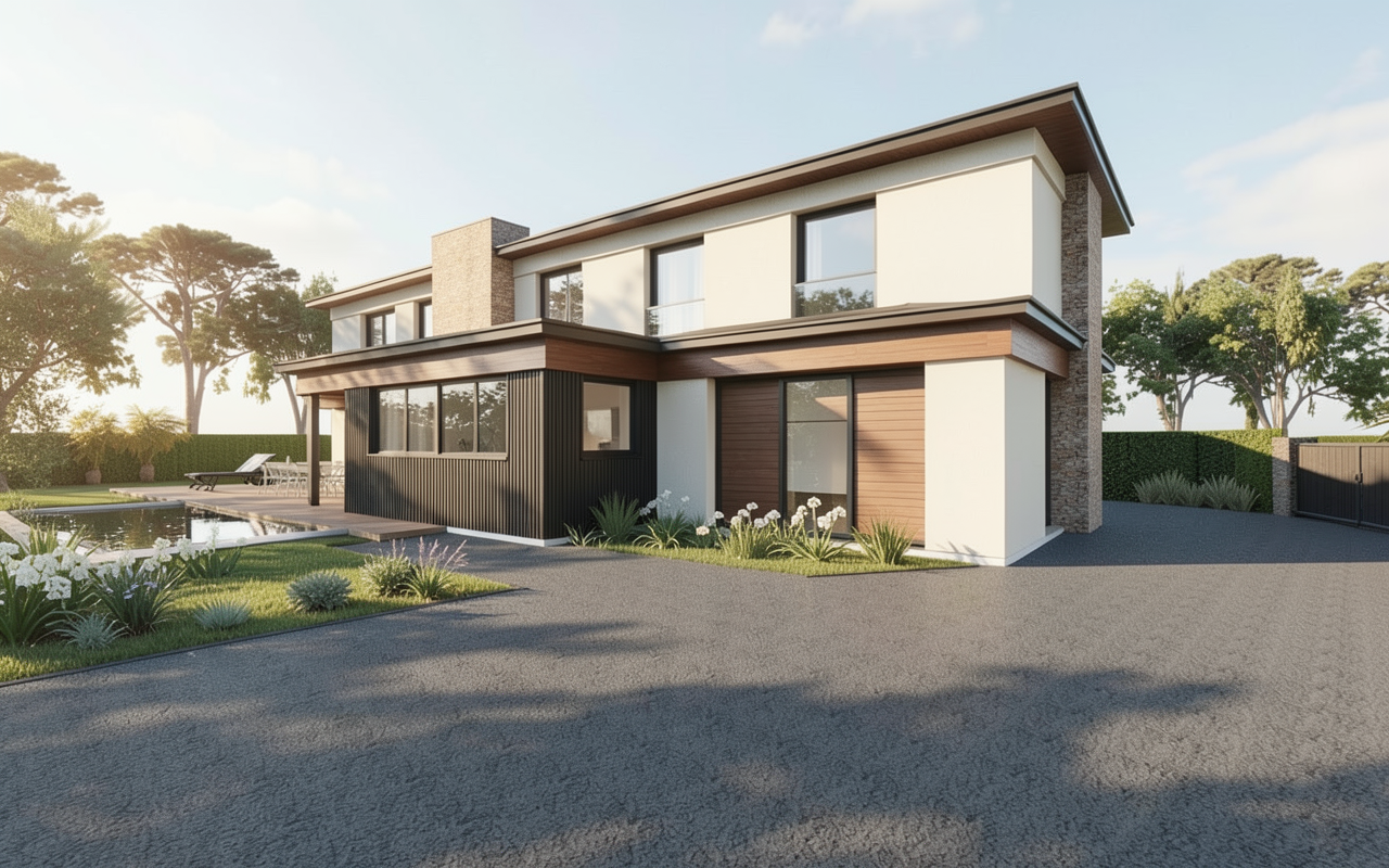create a highly photorealistic high end architectural visualization with an emphasized inviting cozy atmosphere preserve the existing dusk setting and golden hour highlights on the brick facade including the warm glow from all interior windows and the upward downward exterior wall sconces enhance the cozy feeling by slightly intensifying the warm tone of all light sources making the interior spaces appear even more deeply lit and welcoming and creating a soft almost diffused quality to the evening light ensure textures like the brickwork and wood are rendered with extreme detail maintain all scene elements including the vespa the seating area with cushions and the garden layout