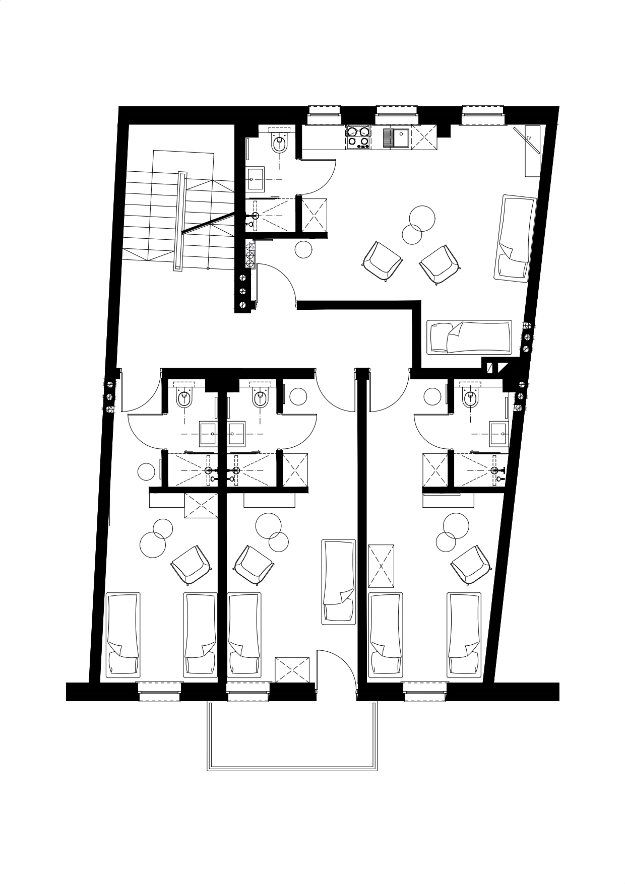 convert this floor plan into a realistic isometric 3d view of a full house show the space from an elevated angle with furniture walls and details visible design hotel room interiors in loft style use the same furniture as shows on the plan do not change the orientation of the floorplan