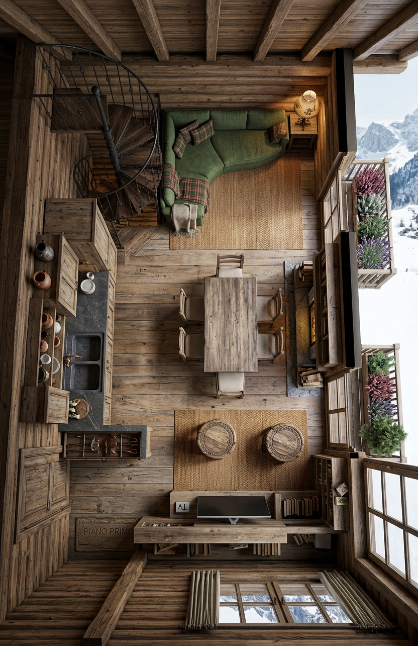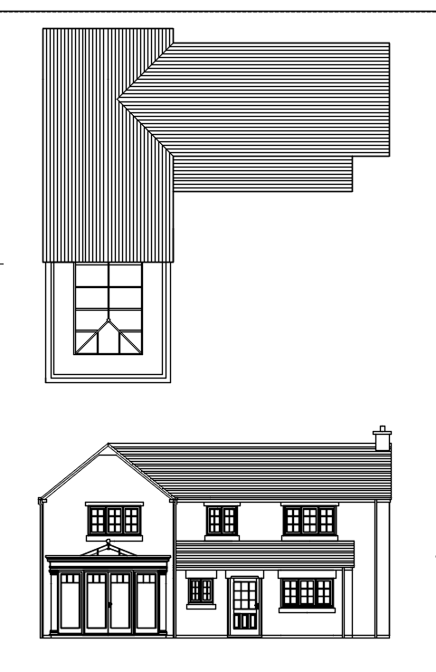 i have drawn a roof plan front elevation use them to create a 2d photo realistic render on the front of the house the walls are a large natural stone the windows are farrow and ball vert de terre the door handles are black the guttering is black the roof tiles are natural slate there is a indian sand stone patio in front of the house with grass in front of that and some wild flowers the property is not surrounded by any other houses