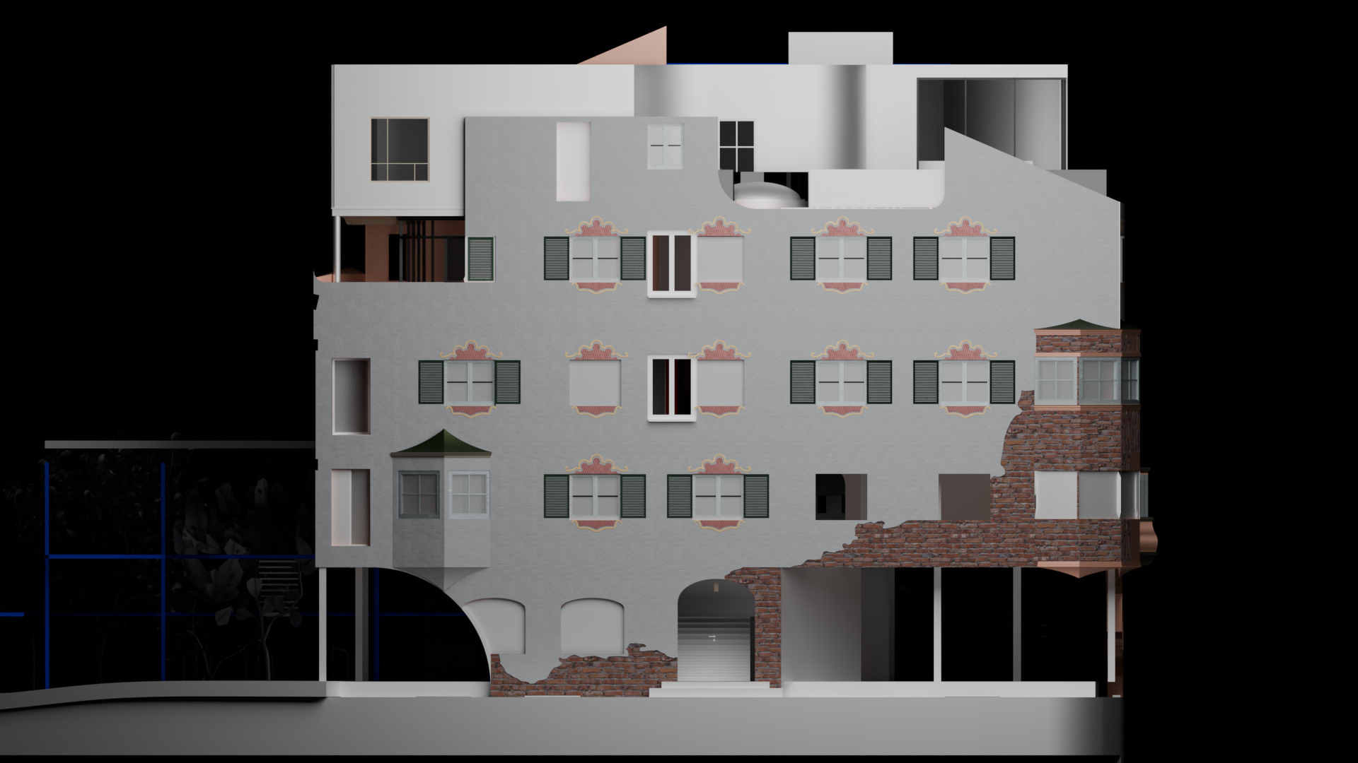 render a detailed beautifully lit architectural facade the building features light grey walls with ornate decorative elements in soft pink and golden accents the windows are framed with deep green shutters highlight the contrasting textures of warm rustic brickwork and smooth white surfaces add a translucent modern glass extension with a reflective blue tint the scene is set during twilight casting a soft ambient glow over the facade with subtle shadows creating a serene and elegant atmosphere
