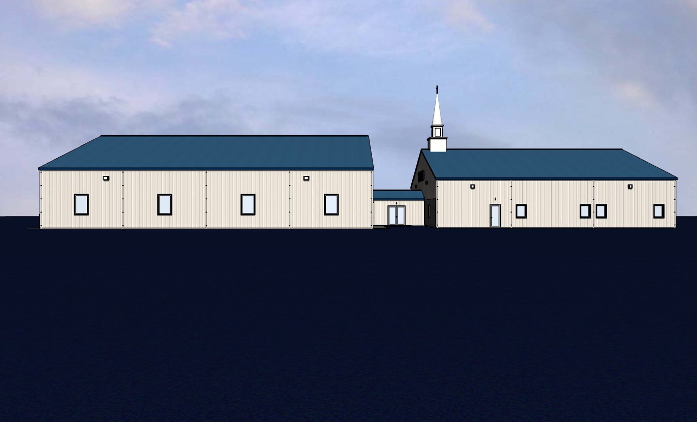 church building in parking lot cream metal siding and blue metal roof