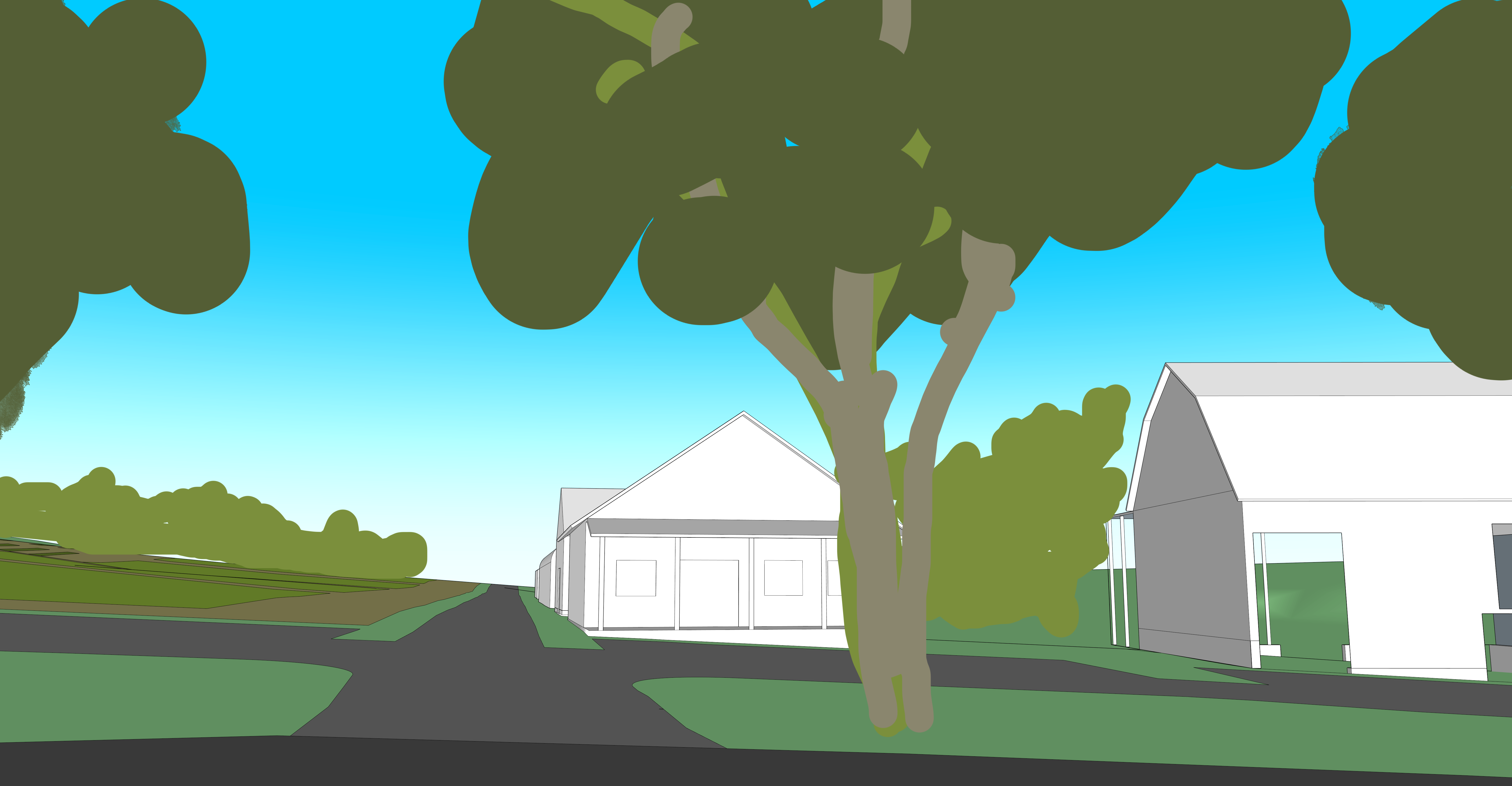 flower farm entrance with rustic barn on right in rural ashville add few parked cars and people render view professional