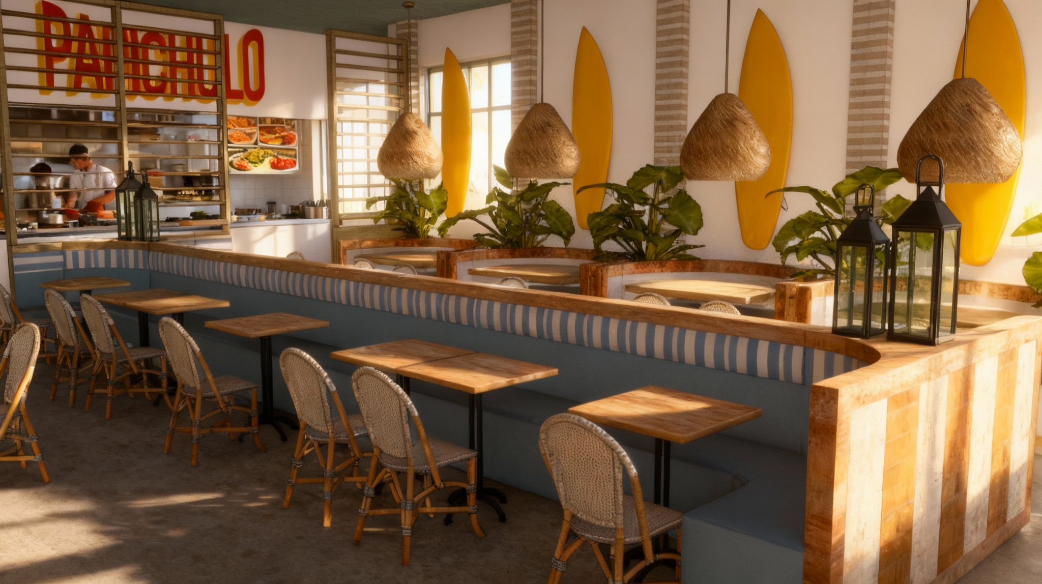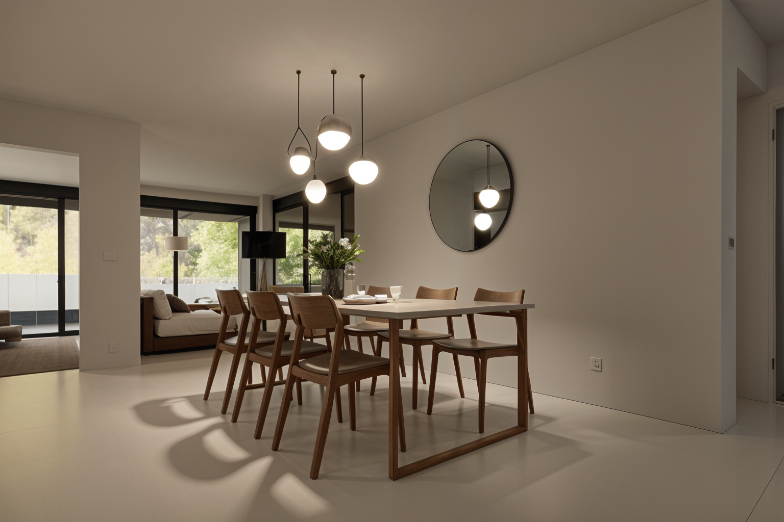 interior shot a modern dining and living area with large windows overlooking a serene lakeside view the ceiling is a soft beige enhancing the warm welcoming atmosphere the pendant lights hang elegantly with metallic gold accents casting a gentle glow the dining table is a minimalist design with a white top and natural wood legs surrounded by sleek wooden chairs with grey cushions the walls are textured in a light subtle grey complementing the light marble flooring with delicate gold veining in the background the living room is furnished with a cream colored sofa adorned with cozy dark cushions the scene evokes a tranquil luxurious ambiance bathed in soft natural light