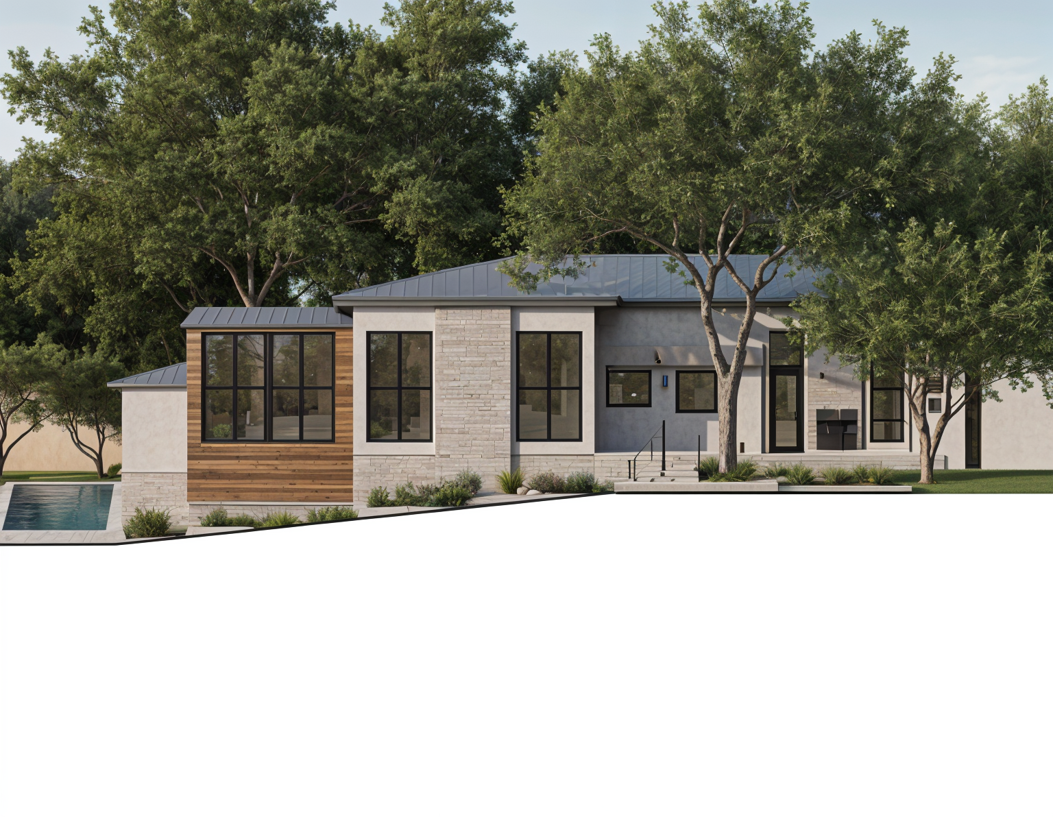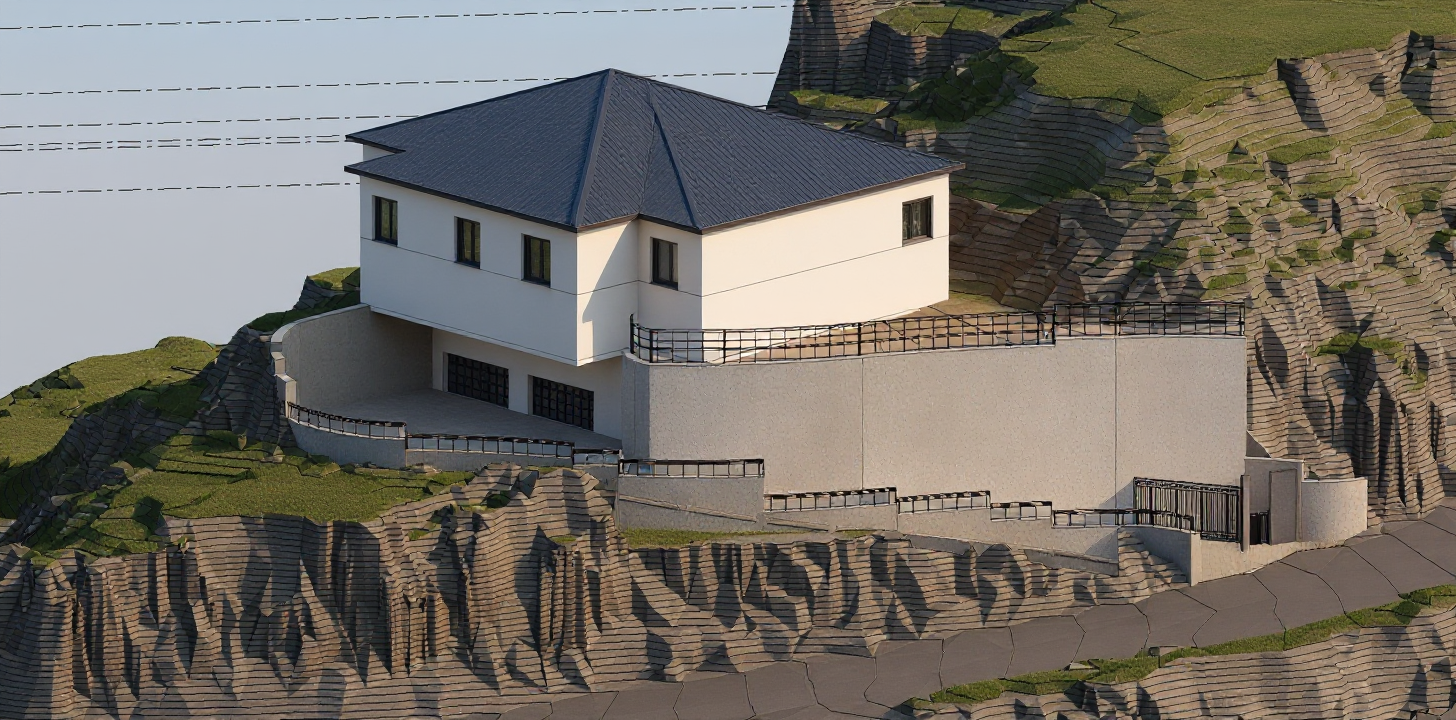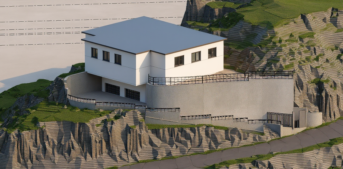 generate a three level organic building with strictly defined stepped massing massing fixed level 1 lowest largest rectangular footprint full width of the building contains the bedrooms front edge extends furthest toward the lake level 2 middle same width as level 1 but with reduced depth shifted backward from level 1 creating a full width terrace on top of level 1 contains the living room the front face of level 2 is exactly one step behind level 1 level 3 top smallest rectangular footprint same width as lower levels but further recessed backward forms a second terrace on top of level 2 pool position very clear on level 3 place a rectangular glass bottom pool the pool must be positioned directly above the living room on level 2 the glass bottom of the pool is the ceiling of the living room no other placement is allowed organic architectural style apply smooth flowing organic geometry across the entire structure while preserving the stepped massing all corners rounded no sharp angles terraces have curved front edges walls and slabs flow into each other with soft radii the three level stepping remains clearly visible despite the curvature fa ades front fa ade lake side shows all three stepped levels each terrace edge forms a curved wave like line level 1 has the largest vertical exposure with curved openings for the bedrooms level 2 fa ade recessed with a large curved glass opening under the glass bottom pool level 3 is furthest back with a low curved fa ade supporting the pool platform rear fa ade hillside levels 1 and 2 partially embedded in the slope with curved retaining walls level 3 emerges cleanly above the slope side fa ades show the stepped volumes clearly level 1 level 2 level 3 all vertical lines bow gently outward or inward corners are rounded and continuous summary constraints stepped geometry must remain exact level 1 largest level 2 recessed level 3 recessed again width alignment preserved across all levels the pool is always on level 3 always above level 2 and its glass bottom living room ceiling curved organic architecture applied everywhere without altering the massing logic architecture