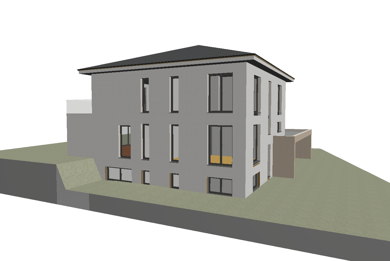 a modern two story house with large windows and a flat roof the house exterior is finished in crisp white with sleek black window frames the picture shows the front yard with straigt driveway to the street and the side elevation the house is situated on a corner property with a street in front and on the right side of the picture the property has a half level slope between the front and backyard the green floor shows the size of property in the original picture