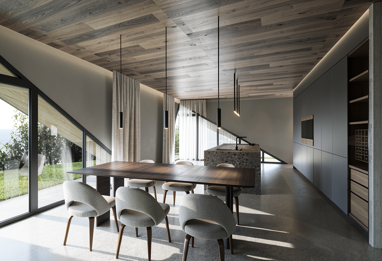 make the image look realistic add real details like architecture magazine photo add ceiling sculptural light pendant
