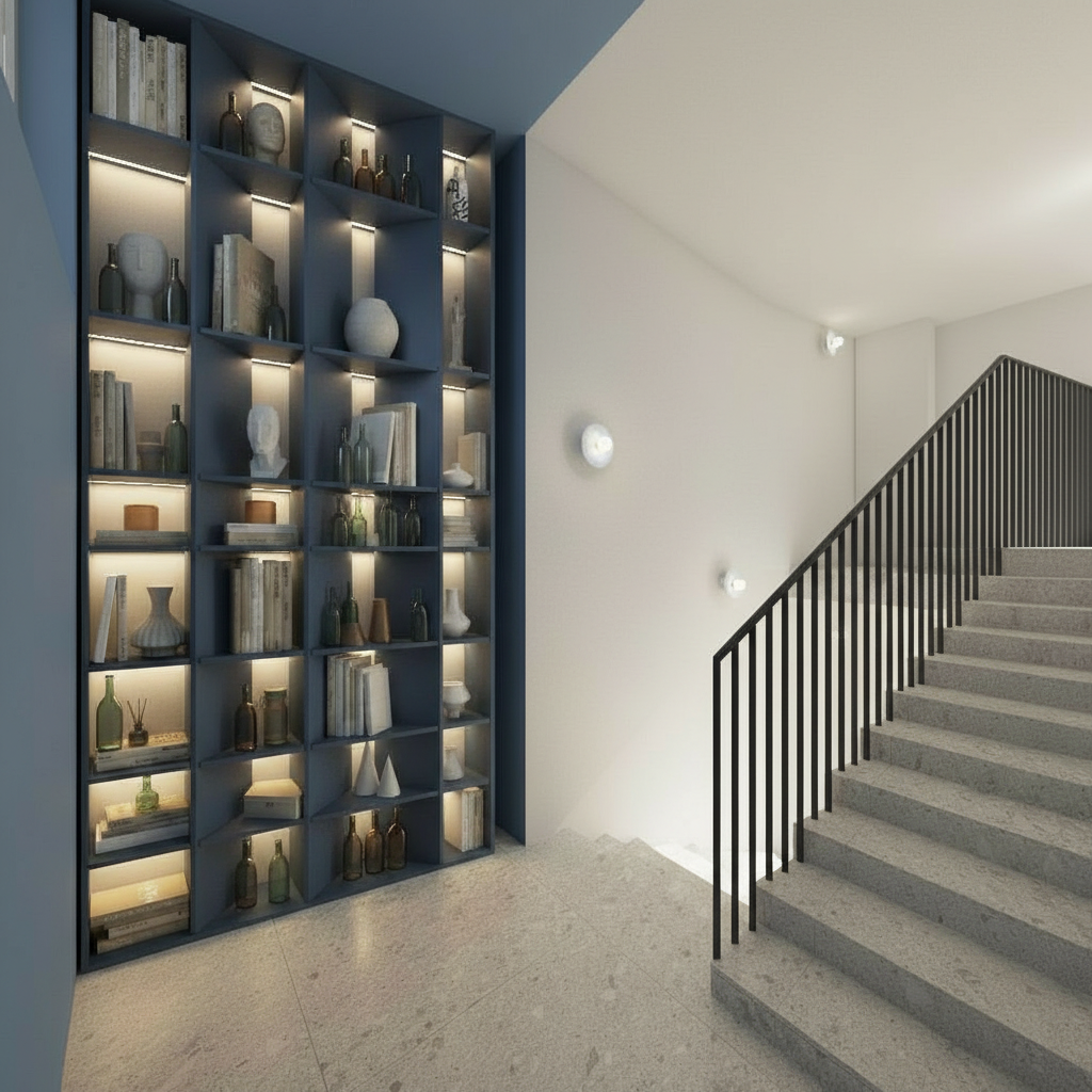 refine realism with realistic materials wooden slats plaster facade graphite perforated balcony railings warm sunlight reflective windows with sunny day do not change the building design structure proportions colors or any architectural elements