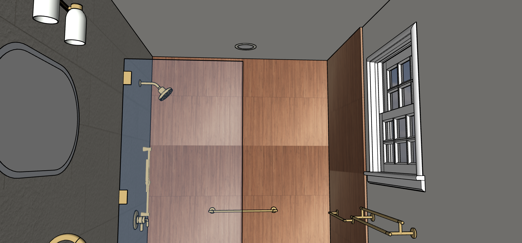 ultra photorealistic render of this bathroom from the exact provided camera view preserving all modeled geometry layout and proportions warm calm modern spa aesthetic with no added d cor or design changes finishes include smooth limestone look flooring textured limestone look wall tile at the vanity and vertical wood look slat tile in the shower floating honey tone wood vanity with white countertop and integrated sink champagne bronze faucet matching shower hardware and grab bars frameless clear fixed glass panel concealed wall drain soft natural daylight with warm ambient fill gentle bounce light realistic reflections accurate surface roughness subtle imperfections and soft shadows high end residential photography realism