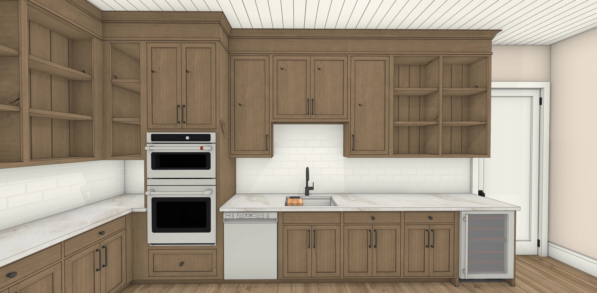 create a 3 d rendering of this photos cabinets are rustic alderwood and back splash is painted white brick architecture