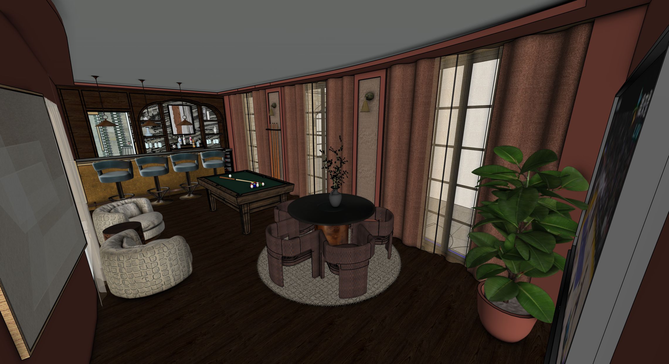 refine the bar interior with subtle high end material and lighting adjustments while preserving the overall design intent and layout update the bar front finish to a realistic brushed brass material with soft reflections and fine directional grain ensure it looks premium and slightly aged not overly shiny or polished remove any led lighting currently applied to the bar front so the brass finish reads clean and uninterrupted introduce concealed led lighting within the recessed sections of the back bar creating a soft halo illumination effect the lighting should be warm and ambient gently outlining the recesses without altering the structure materials or overall appearance of the back bar do not redesign the back bar only enhance it with subtle lighting change the floor pattern to a herringbone layout maintaining the existing timber colour tone and finish ensure the pattern is clearly visible but natural and in scale with the space add framed artwork to the left hand side of the image include the not drunk just tipsy penguin books style artwork properly scaled and neatly framed to suit the interior aesthetic ensure it integrates naturally with the scene and lighting maintain a realistic architectural visualization style with balanced lighting accurate material textures and cohesive composition