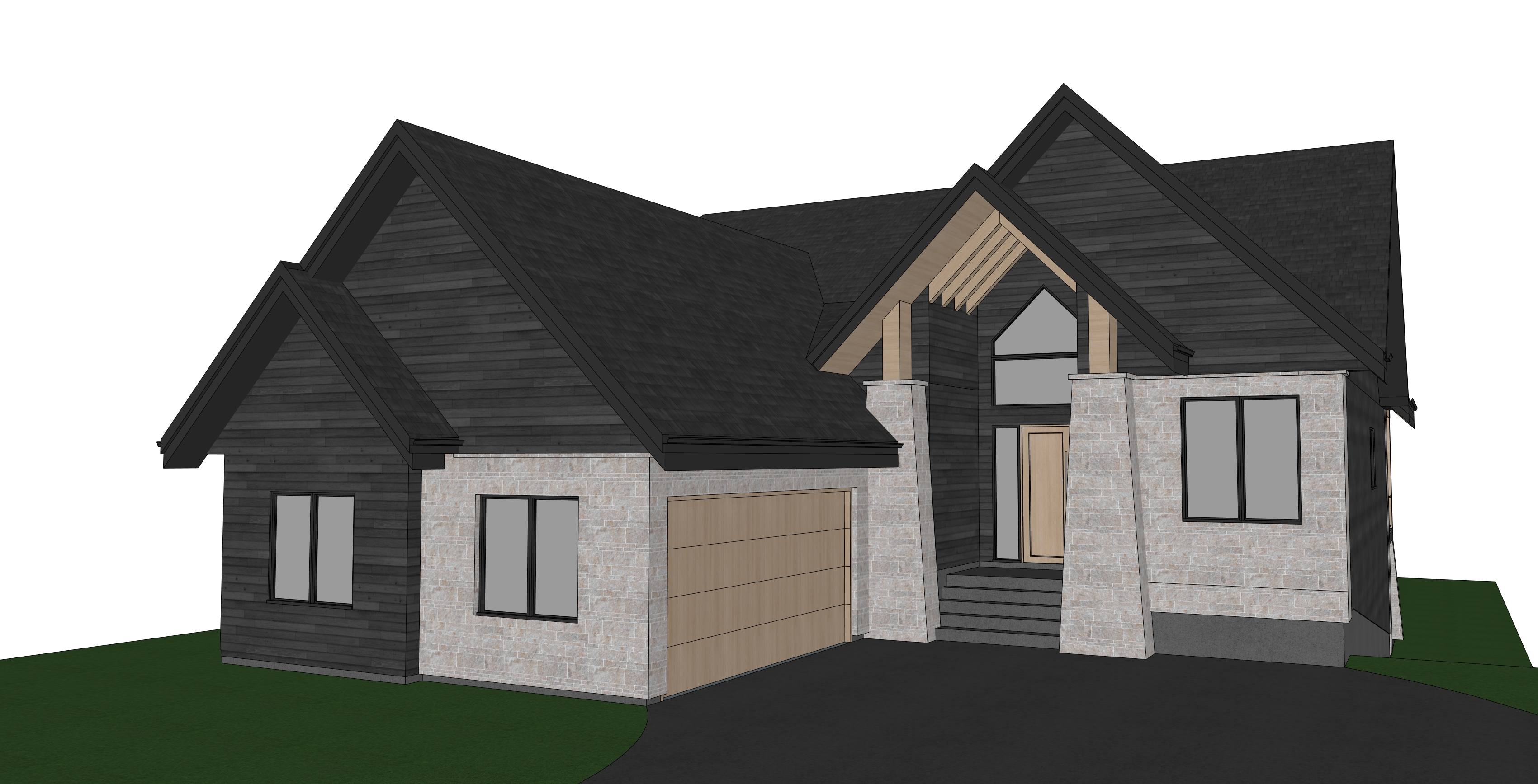 this walkout home is in a housing development in winnipeg manitoba and there is a retaining pond small lake in the background other medium to large walkout homes will be visible across the lake in the backyard some tasteful restrained landscaping with low flowers and shrubs and bushes exterior materials should be clean and modern