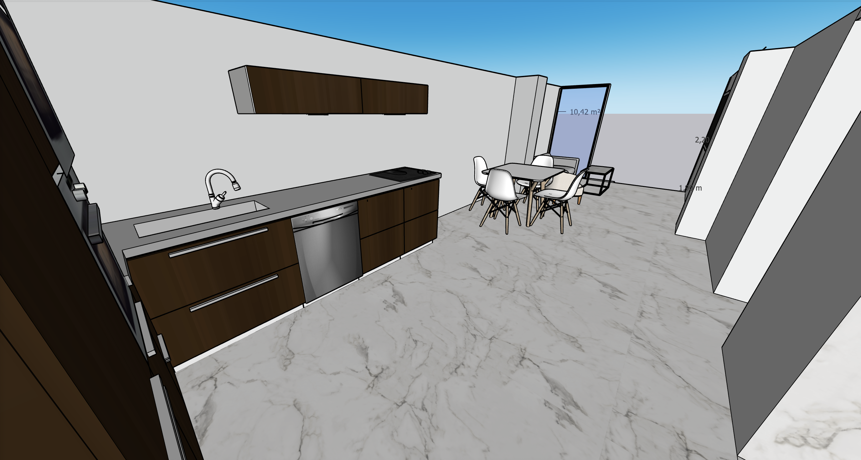 photorealistic interior render based strictly on the provided image and exact sketchup geometry do not modify any walls remove or add columns change ceiling height or alter room dimensions the structural pillar previously shown is fully removed the wall is straight and continuous no column or vertical element is allowed preserve all cabinet dimensions exactly as modeled in sketchup tall cabinets keep their original height do not extend upward upper cabinets keep the exact size depth and placement as in the sketchup model no redesign or reinterpretation of cabinet geometry modern open plan kitchen dining and living area with a calm greige color palette matte finishes and subtle natural oak accents kitchen l shaped layout unchanged slim upper cabinets on the right hand wall only flat fronts same greige tone as base cabinets upper cabinets must visually match the sketchup model not a showroom reinterpretation induction cooktop with integrated downdraft extractor no wall hood no ceiling hood integrated warm led lighting beneath upper cabinets microcement polished plaster wall finish behind the kitchen dining area remains centered and unchanged living area layout must match the sketchup reference sofa positioned behind the dining table not closer to the kitchen maintain clear circulation between kitchen dining and living areas television mounted directly on the right rear wall wall hung no tv bench or media cabinet underneath sliding doors remain unchanged view through doors shows mediterranean exterior with palm trees floor to ceiling curtains at the doors heavy velvet fabric in warm gold tone elegant folds mounted close to ceiling height open to frame the view flooring remains large format marble look porcelain tiles with warm undertone matte finish walls in soft warm greige smooth finish ceiling lighting designed for low ceiling height ultra slim recessed or flush mounted micro downlights only no lowered ceiling no soffits no added ceiling elements scandinavian mediterranean modern style calm premium realistic airbnb ready buildable camera perspective must match the provided angle field of view 60 65 degrees no wide angle distortion ultra realistic materials accurate scale natural lighting balance no people no plants indoors no artwork no decorative clutter no furniture repositioning beyond what is explicitly specified