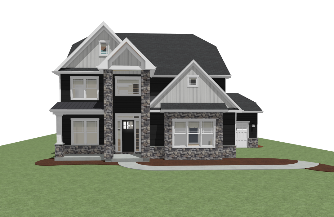 render this 3d image to appear photo realistic maintain all existing architectural materials and structural elements exactly as shown enhance the setting with a lush well maintained landscape include minimal beds manicured shrubs and a tree lined backdrop that frames the home naturally the windows should have a glossy finish with clear reflections of the surrounding trees and sky lighting should feel natural with soft shadows and realistic depth to bring the scene to life