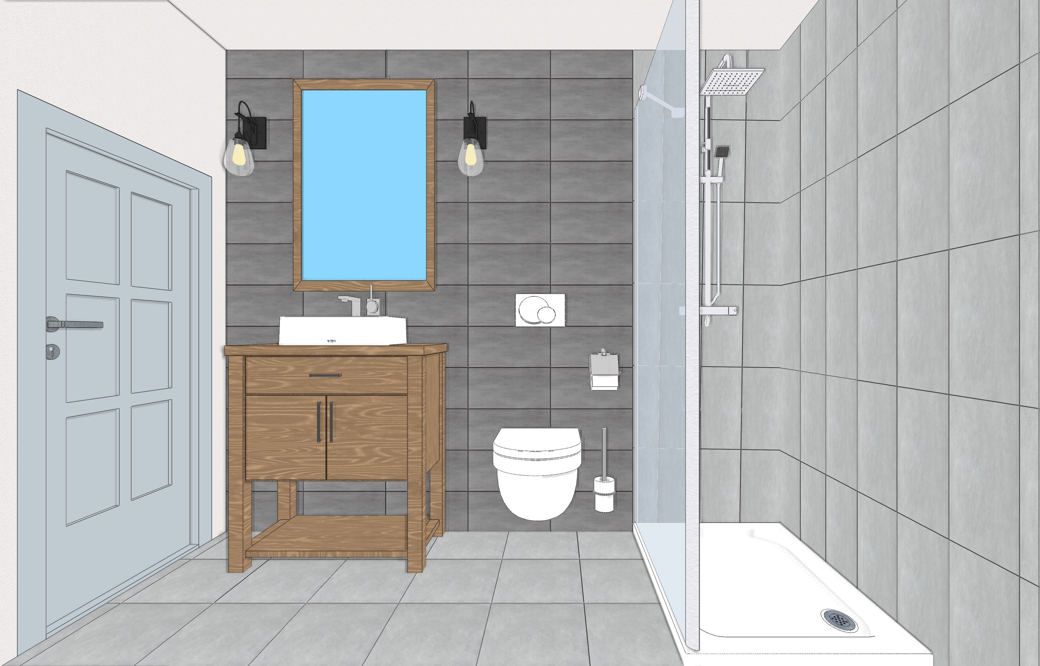 create a beautifully rendered modern bathroom scene the atmosphere should be serene and inviting use soft gray tiles for the walls and floor emitting a clean and calming vibe the bathroom vanity should be a rich oak wood color adding warmth and elegance incorporate a large light blue mirror framed in oak complementing the vanity the shower panel should be transparent glass adding an open and airy feel accentuate with matte black light fixtures to add contrast and sophistication the door should be a soft pastel blue adding a touch of tranquility bright white fixtures for the toilet and sink emphasize cleanliness and modern design use soft natural lighting to enhance the colors and create a peaceful atmosphere