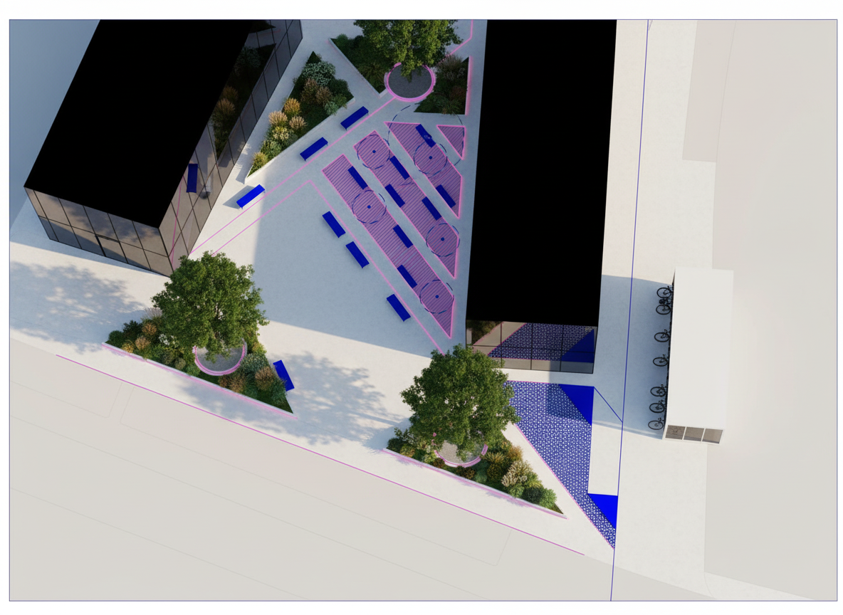 make the benches wooden and the space between buildings other than pathway actually meadow elevate the blue bricles between benches as they represent trees and make the pink stripes between them landscape perrineal beds with low plants move and scale the bike storage on the blue hatched surface more left where there is blue triangled and make a roofgarden on the right building