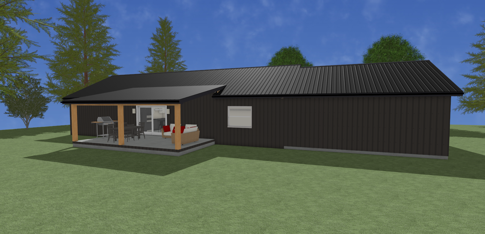 ultra high resolution photorealistic rendering of a modern single story house with dark charcoal abm panel siding featuring exposed fasteners and a black metal roof the structure has a covered rear patio supported by natural wood posts furnished with outdoor seating and a grill setup the house includes white awning windows and sliding glass patio doors retain all existing dimensions proportions and architectural details exactly as shown surround the house with a lush green forest with sunlight shining brightly through the branches casting soft and natural shadows blending naturally with the landscape emphasize realistic materials detailed lighting accurate reflections and high depth of field creating a warm vibrant and inviting outdoor atmosphere