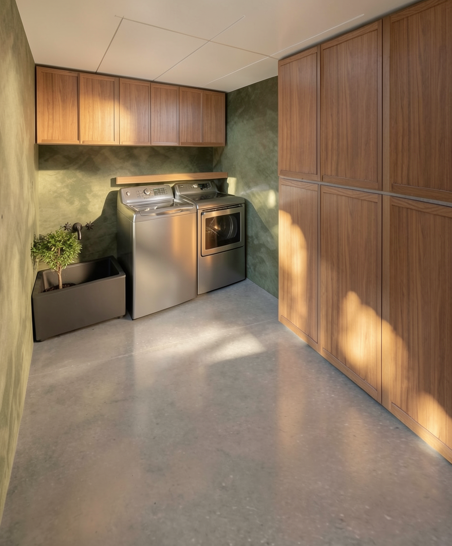 pavement with rectangular slabs bush hammered in gray ticino granite lateral and central parallelepipeds in rough stone insert a fountain in the central stone place the design on a lawn put a person drinking from the fountain