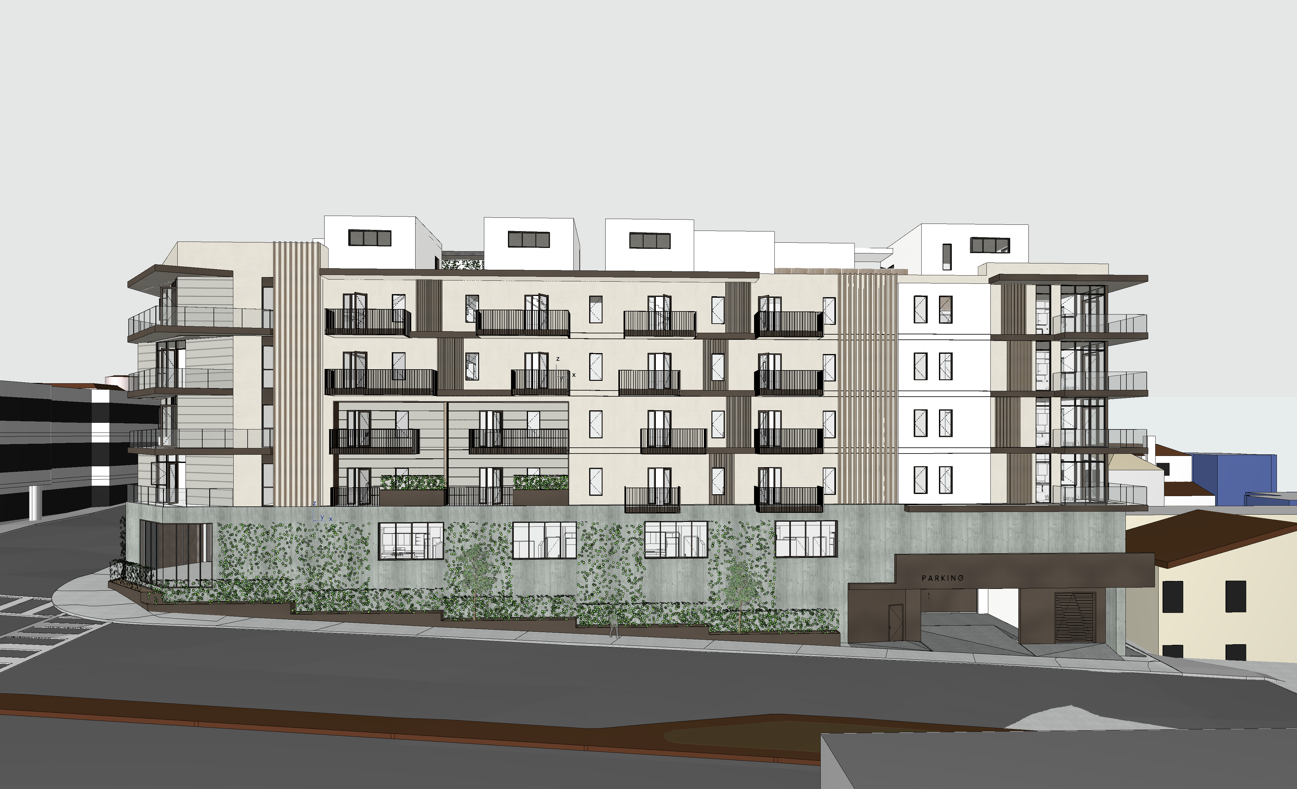 do not change the architecture at all smooth trowel stucco with light sand color light board form concrete plinth horizontal metal panel siding in light beige color slightly darker than stucco dark brown metal railings and horizontal fascia clean modern lines do not change the architecture at all morning sky with thick marine layer fog
