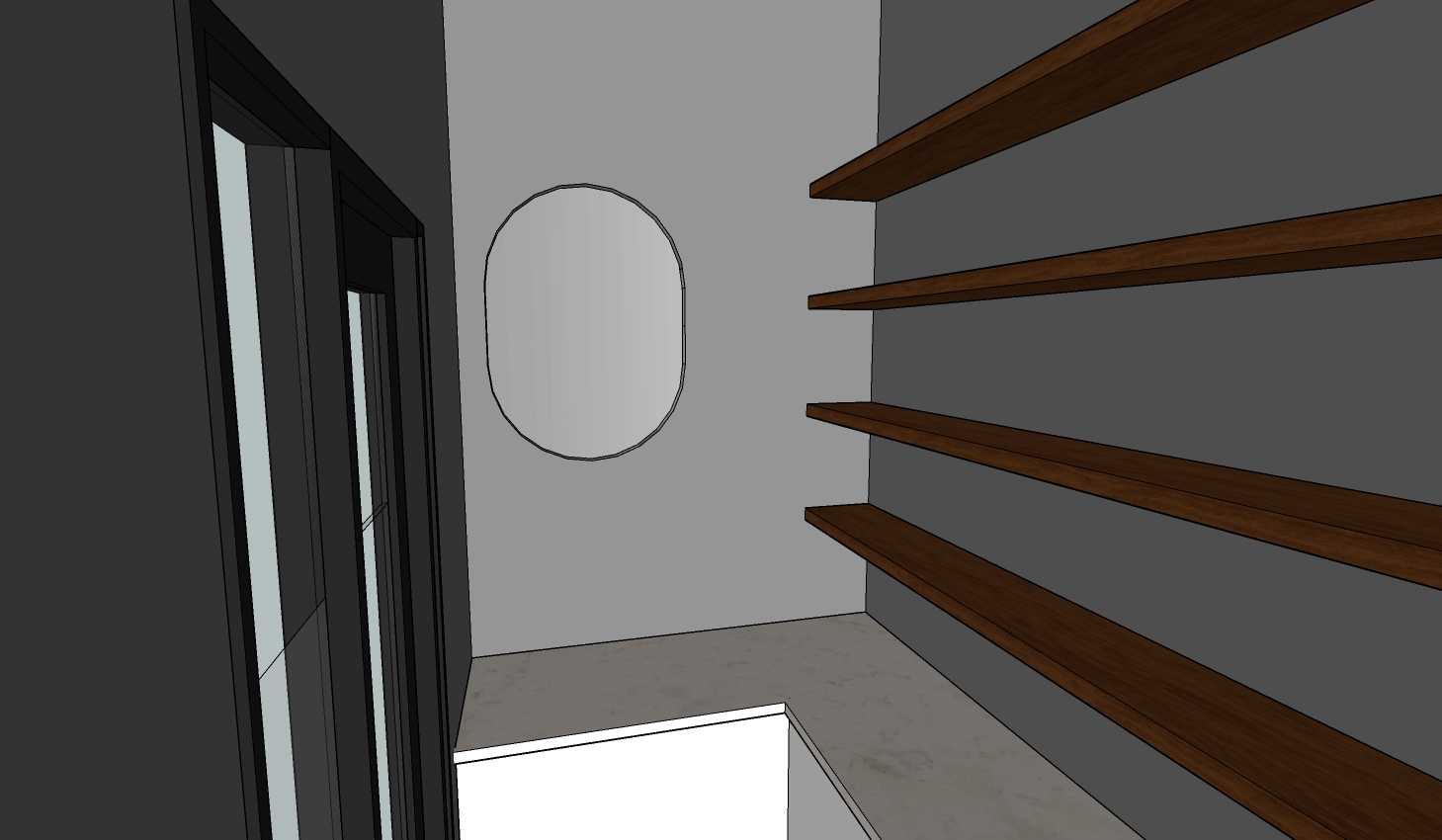 pantry with white shelves a white marble countertop and off white blue lower cabinets the door should be white