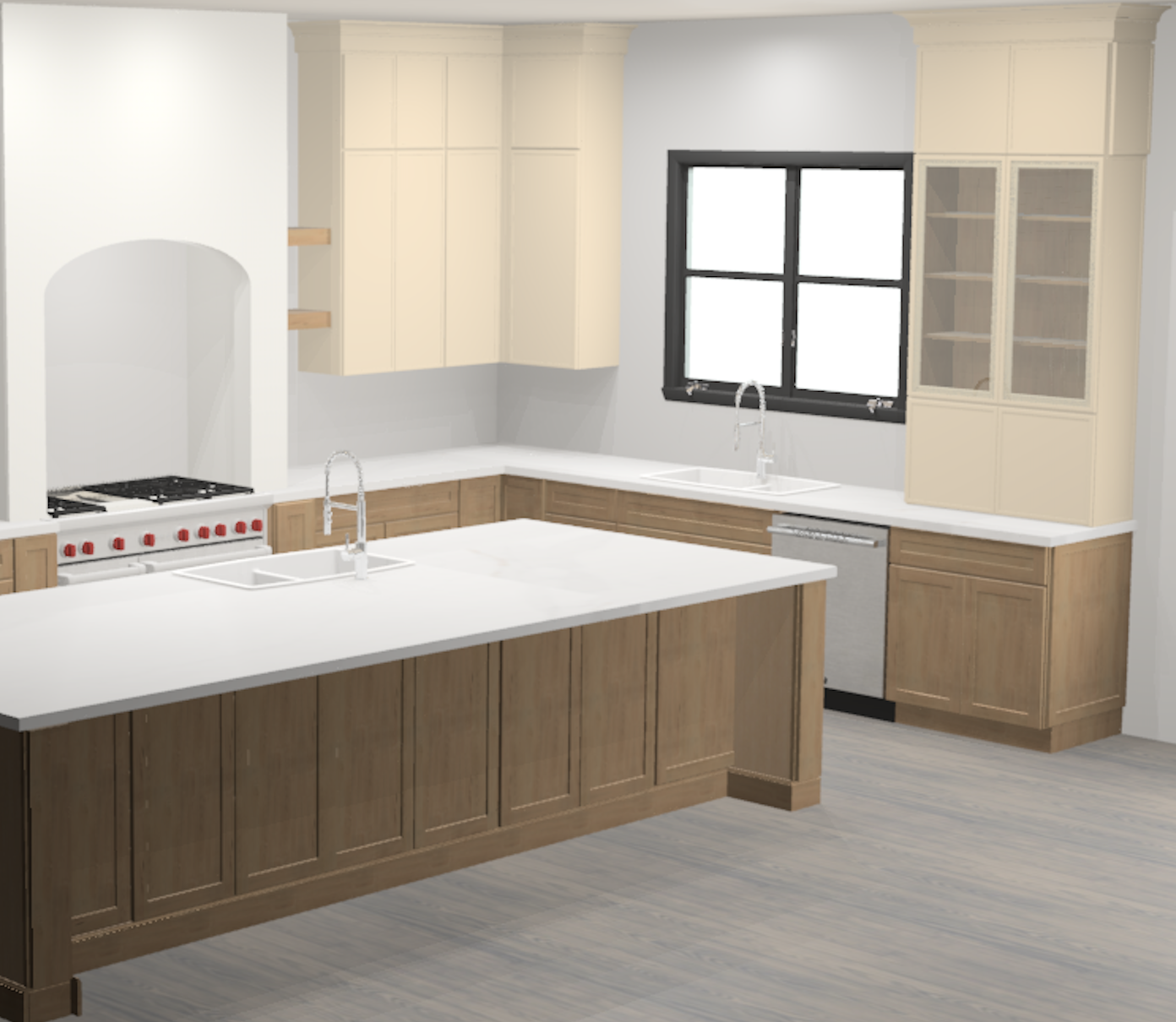 all bottom cabinets should match the island in the wood color and the top cabinets should be off white