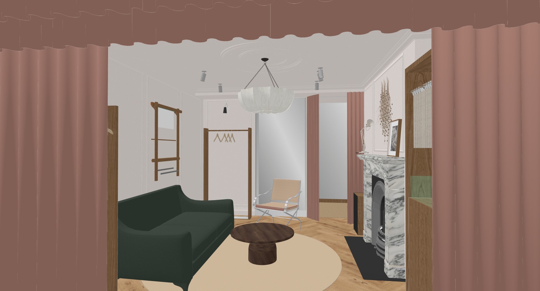 make a photorealistic render of this retail space do not change any design details walls have a soft limewash finish on top of wall panelling on a sunny day