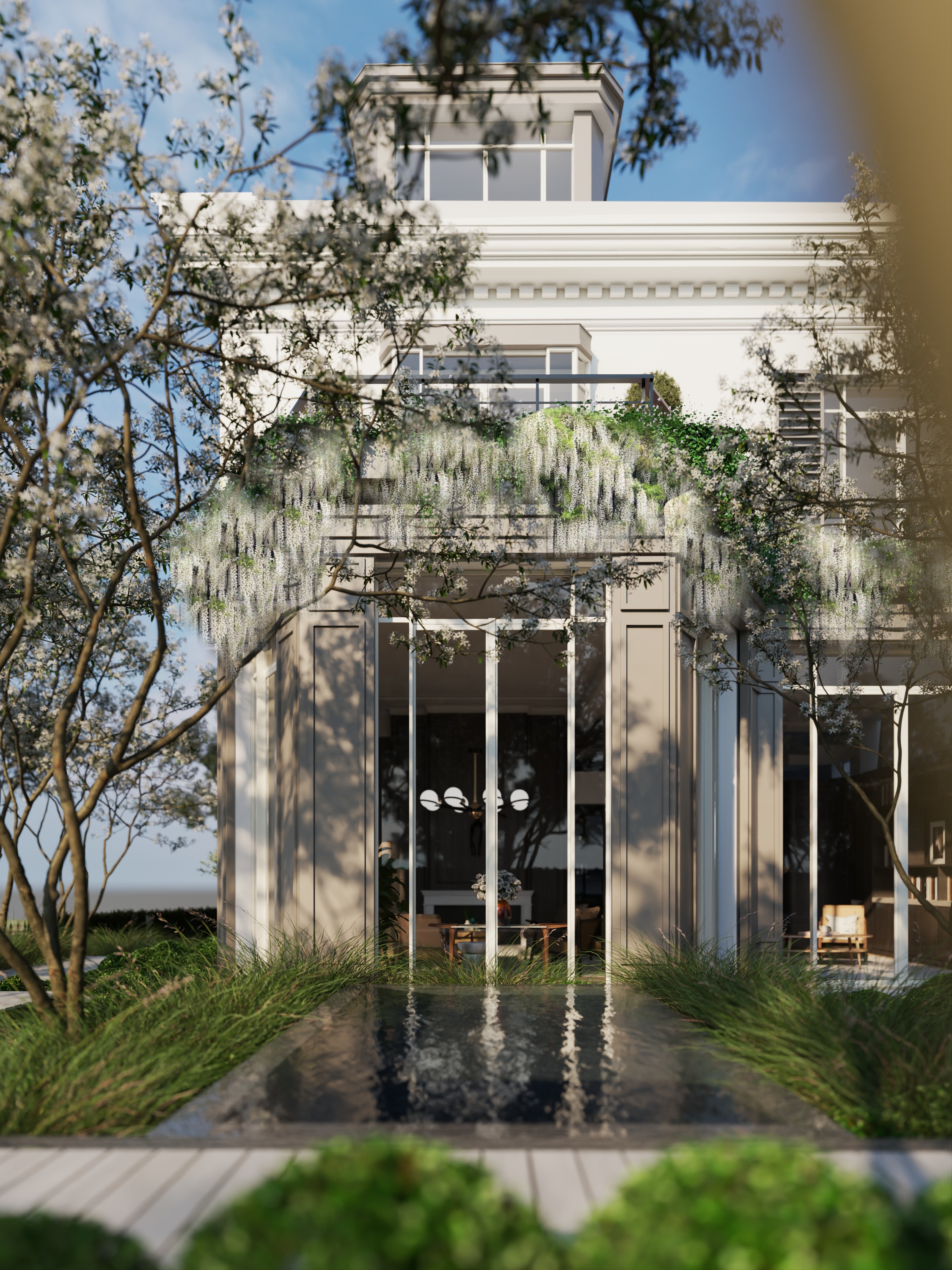 render into real image and keep it composition same make it blend vegetation with environment soft dawn light ambience fix the white wisteria vines to be more natural