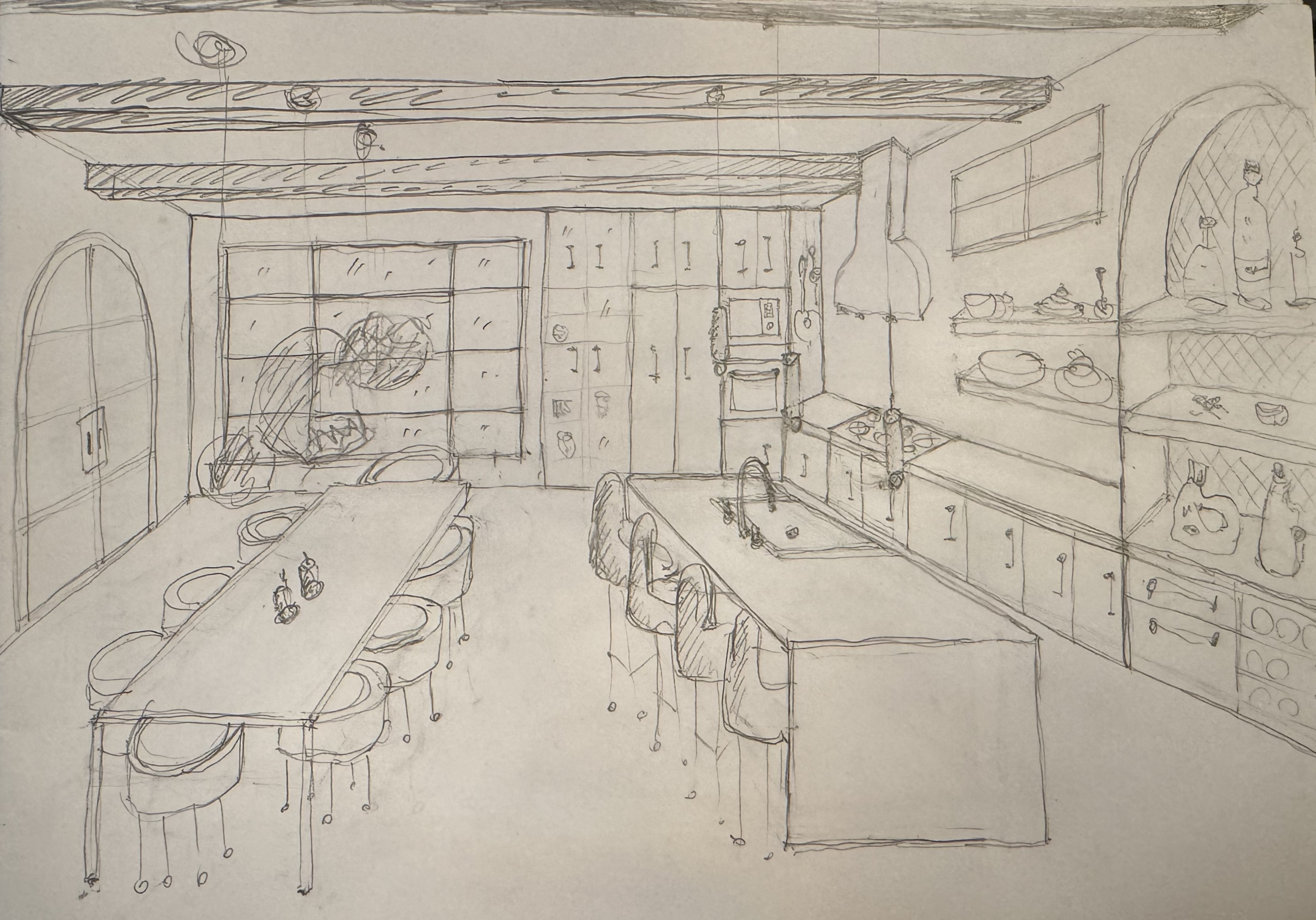 perspective shot create a detailed rendering of a cozy rustic kitchen interior use warm earth tones and soft lighting for an inviting atmosphere the wooden beams on the ceiling should be a rich dark brown paint the walls in a soft beige the large central dining table should be a natural oak color surrounded by chairs with a deep olive green fabric the kitchen island should feature a marble countertop in gray with subtle white veining cabinetry should be a soft cream color with brushed metal handles add subtle warm light fixtures from the ceiling and ensure the countertops have stylish kitchen appliances in brushed stainless steel infuse a sense of warmth and homeliness with potted plants ceramic bowls in muted tones and rustic decorations on shelves the overall atmosphere should be welcoming and warm blending elegance with rustic charm