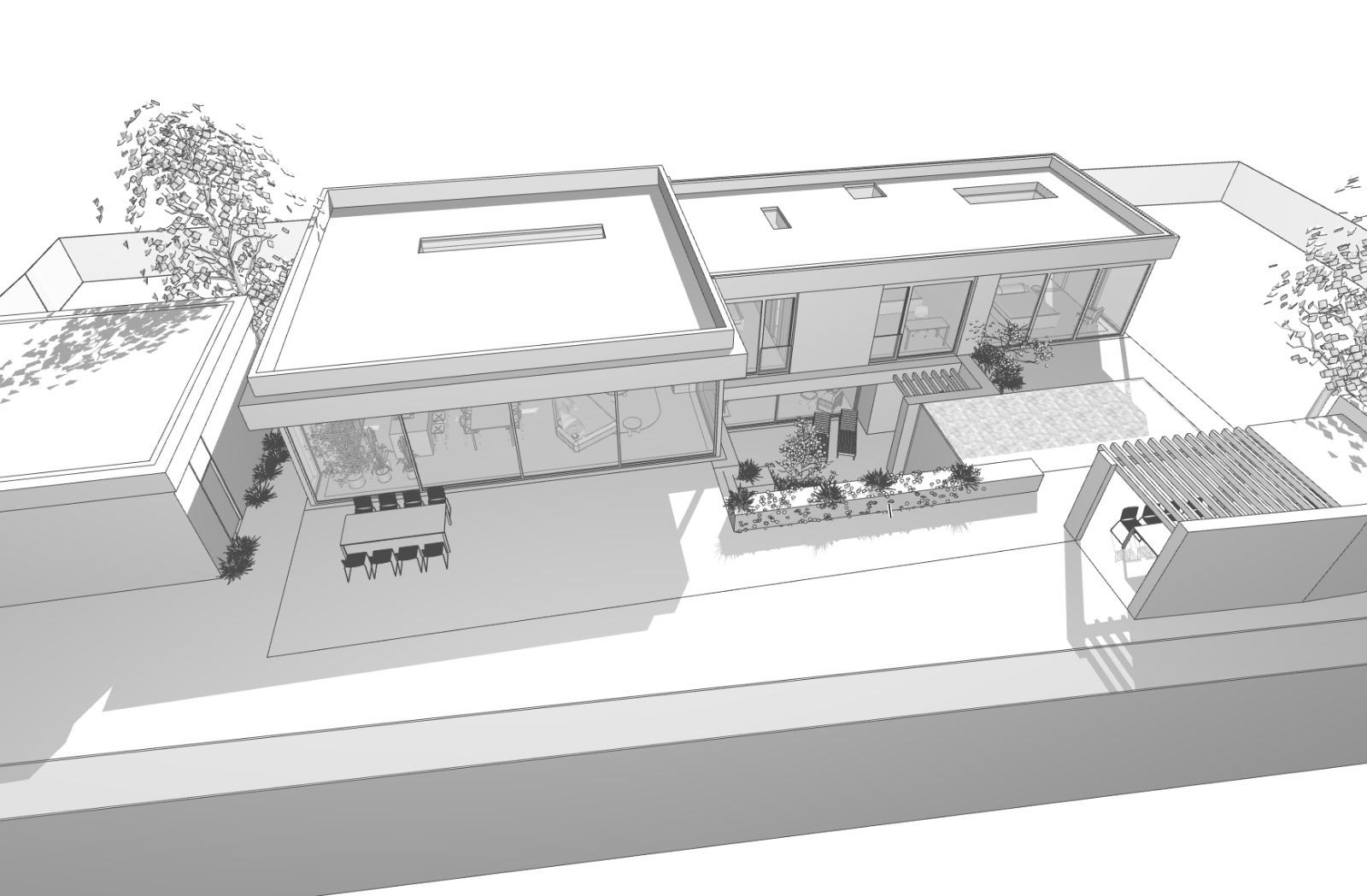 imagine a modern minimalist house bathed in soft golden sunlight featuring clean and sleek architectural lines the exterior walls are painted in a warm sandy beige contrasted by large glass windows reflecting the serene blue sky green foliage and small trees surround the house adding vividness with their lush green leaves the patio area has elegant charcoal gray furniture set against a light stone or beige tiled floor the atmosphere is calm and inviting evoking a sense of tranquility and sophistication